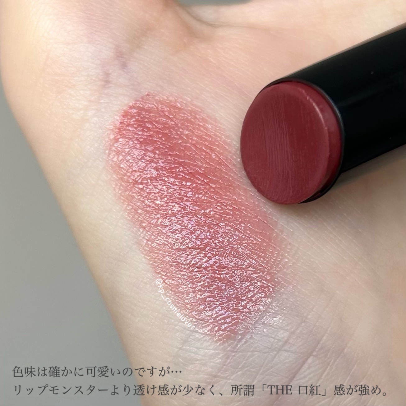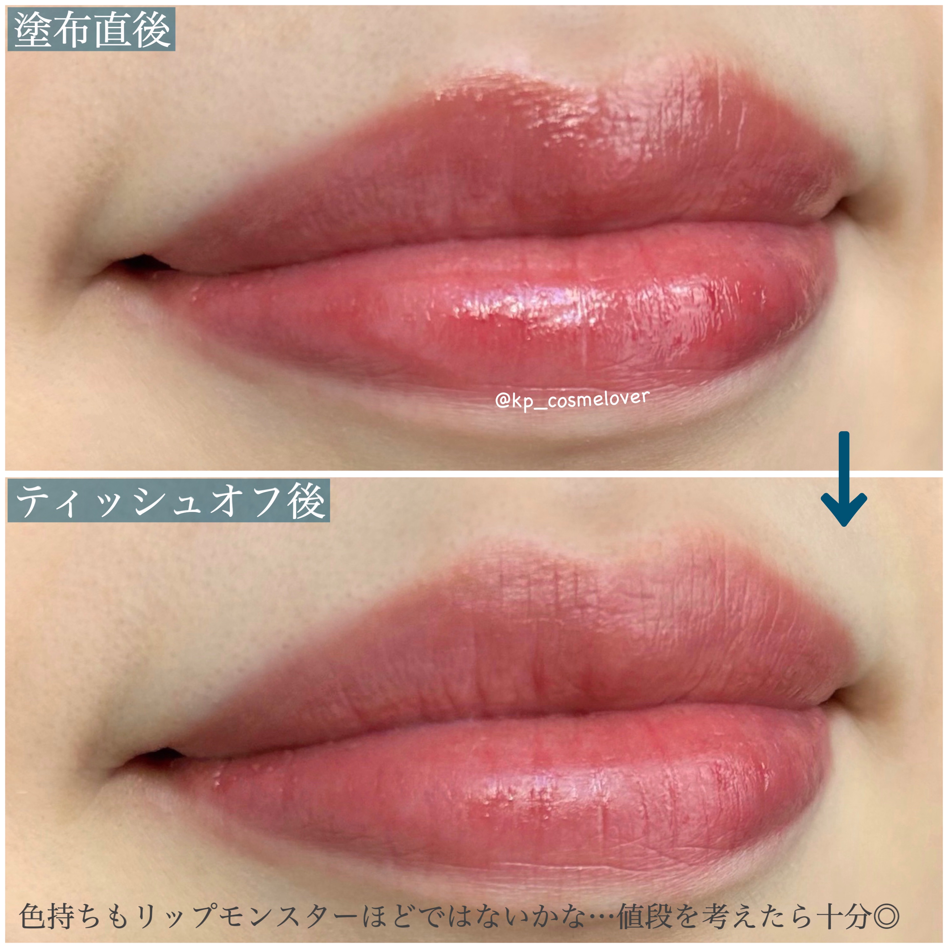 保湿力が高く、最近唇が荒れやすい私でも問題なく使えました❣️ シアーな発色で、リップクリーム感覚でぐりぐりと塗っていますが、色味と艶感が絶妙🤤 ティッシュオフしなくてもマスクにつきにくく、色持ちもすごく良いです💋 今まで買わなかったことに後悔しかないです😫 次はどの色を買おうか、今からワクワクしています💕