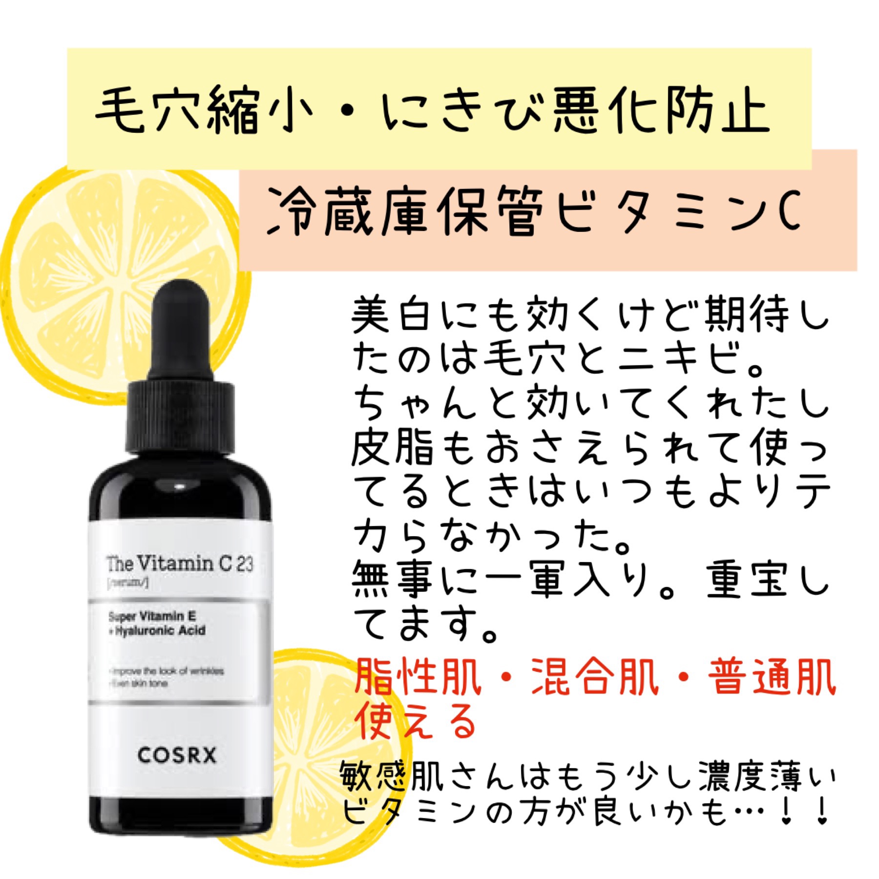 COSRXRXザ・ビタミンC23セラムこれまでもビタミンC美容液は色々試してきましたが、こちらは23%の高濃度なのに思ったより使いやすく、敏感肌の私でも安心して取り入れられました👍😊効果テクスチャーは少しとろみのあるオイル状で、肌にのせるとス...