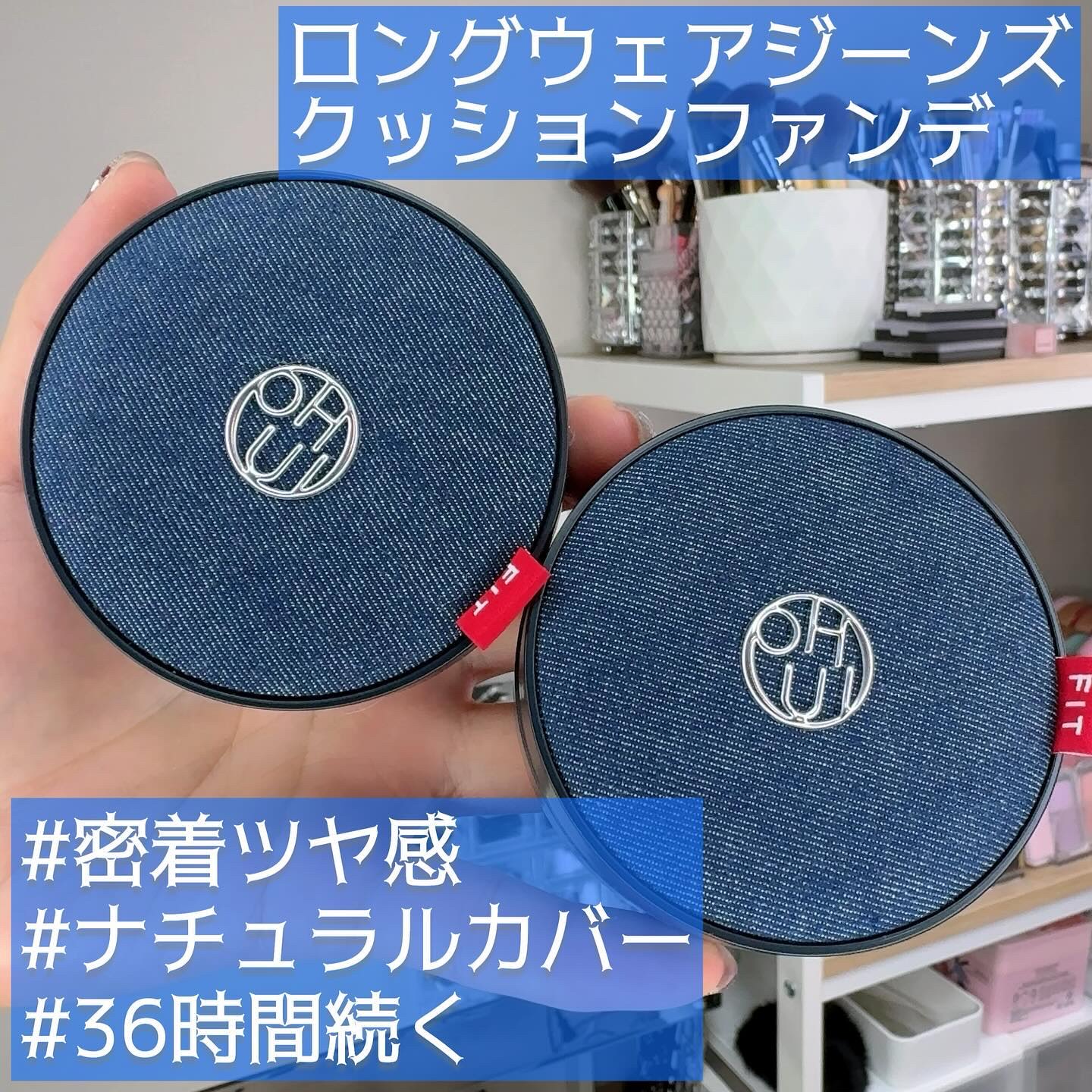 デニムパケが可愛いすぎる クッションファンデ💙ˊ˗ みずみずしいウォータリーテクスチャー スーッと肌になじんで、伸びがいい◎ 36時間持続するカバー力で、1日中透明でキレイな肌に!