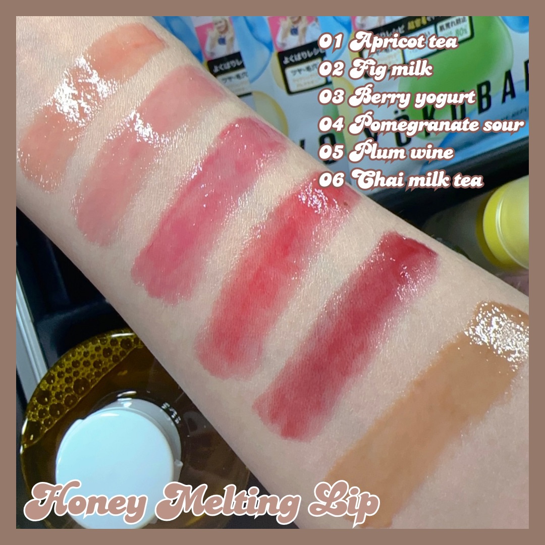ハニーメルティングリップは新色含めて全16色😳 私が使ったのは、自分のパーソナルカラーにピッタリのカラーが見つかる02と03。 唇に触れた瞬間とろけるテクスチャー。 ツヤツヤぷるぷるに見える🥺 マヌカハニーエキス(保湿成分)配合で唇にツヤを与えてくれるよ✨