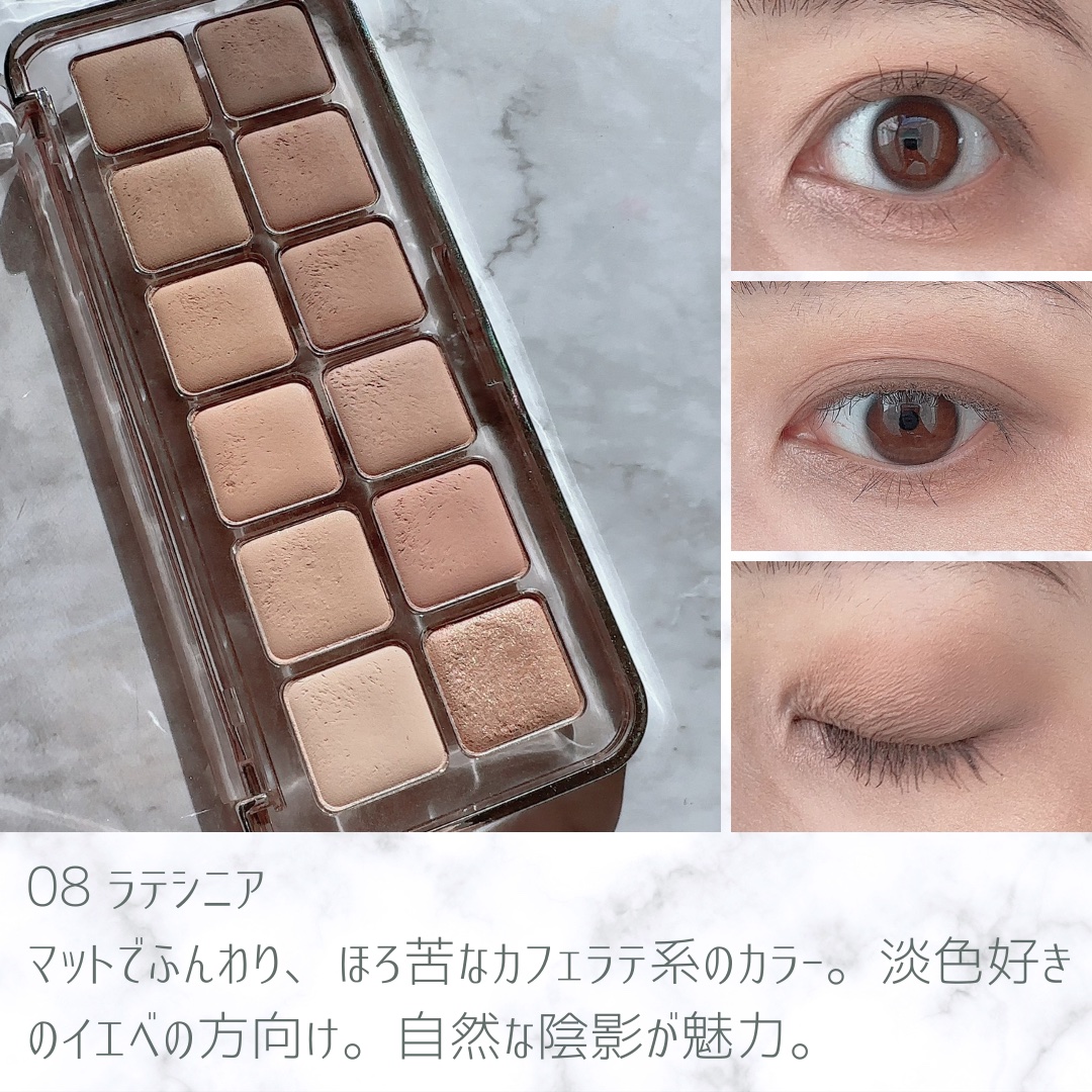 全体的に発色は薄めでマット。 淡色パウダーでまぶたの色を自然に補正しながら、濃いめの色で印影をふわっと出すものです。 同系色の、視力検査か!?と思うような色合いがぎゅっとつまっているので、色々塗り重ねてるうちにベストなグラデーションが簡単に作れます。 07 ラベンダースタッフ パーソナルカラーはブルベ夏の方向け。 真ん中のピンク色2色がとにかくクリアで可愛すぎる! 意外と優しい発色なので、じんわり内側から光るような透明感が出てくれるのがとにかく可愛い。うん、可愛い。 08 ラテシニア パーソナルカラーは淡い色が使いたいイエベ秋の方、明るいく薄めの色が得意なイエベ春の方におすすめ。 右側の下から2番目のピンクがいちばんのお気に入り。 血色となじみに特化したピンクが絶妙すぎます。 涙袋メイクのベースにもすごく使いやすい。