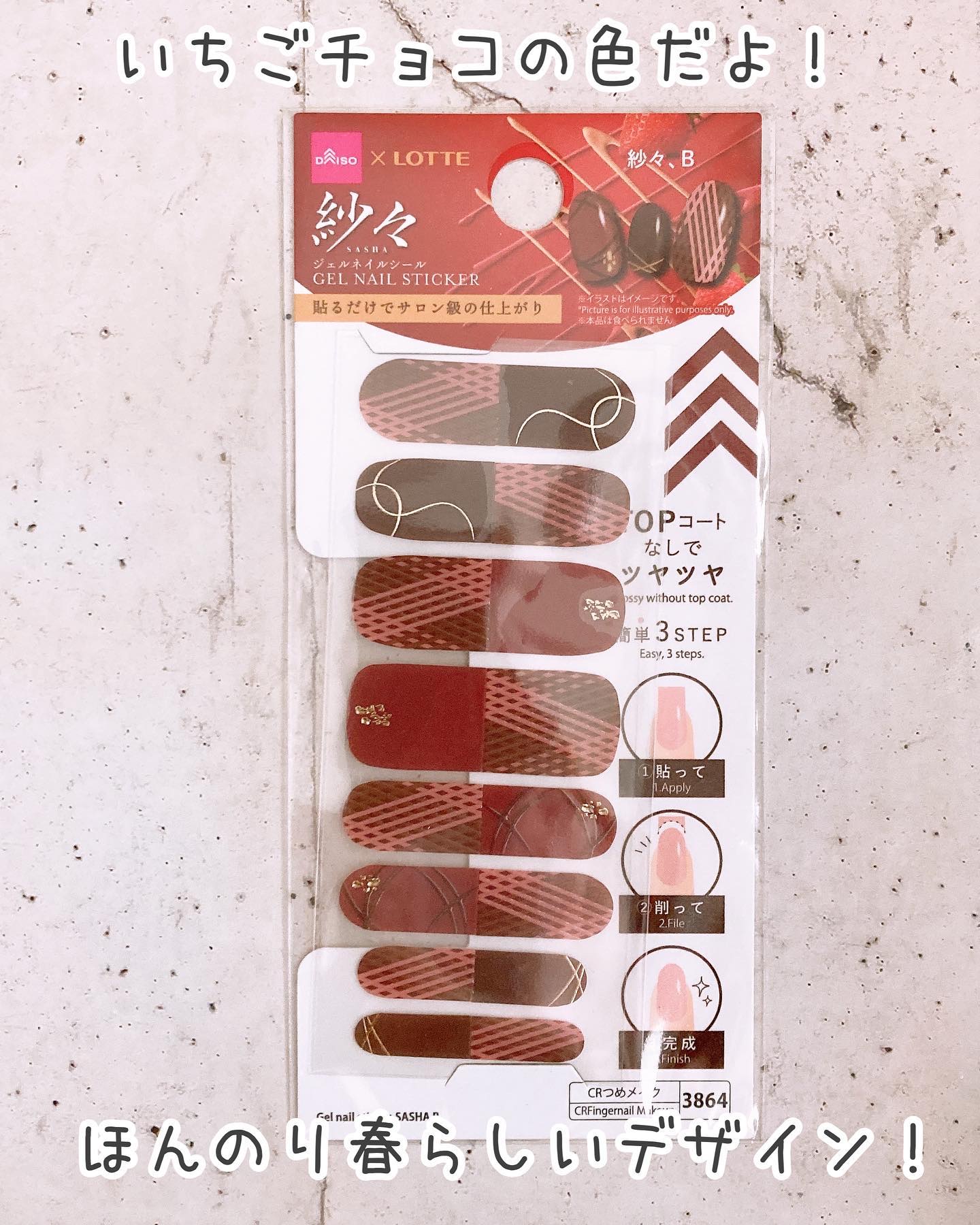 ダイソーは毎年人気の紗々ネイル! 今年はリボンのデザインがお気に入り!貼ってみるのが楽しみです✨ セリアはチョコ以外にもあって、ホワイトデーにも良さそうです! 明るくてかわいらしい雰囲気でした! ダイソーの硬化タイプのブラウン系もいい感じ! 剥がれにくいのでおすすめです✨