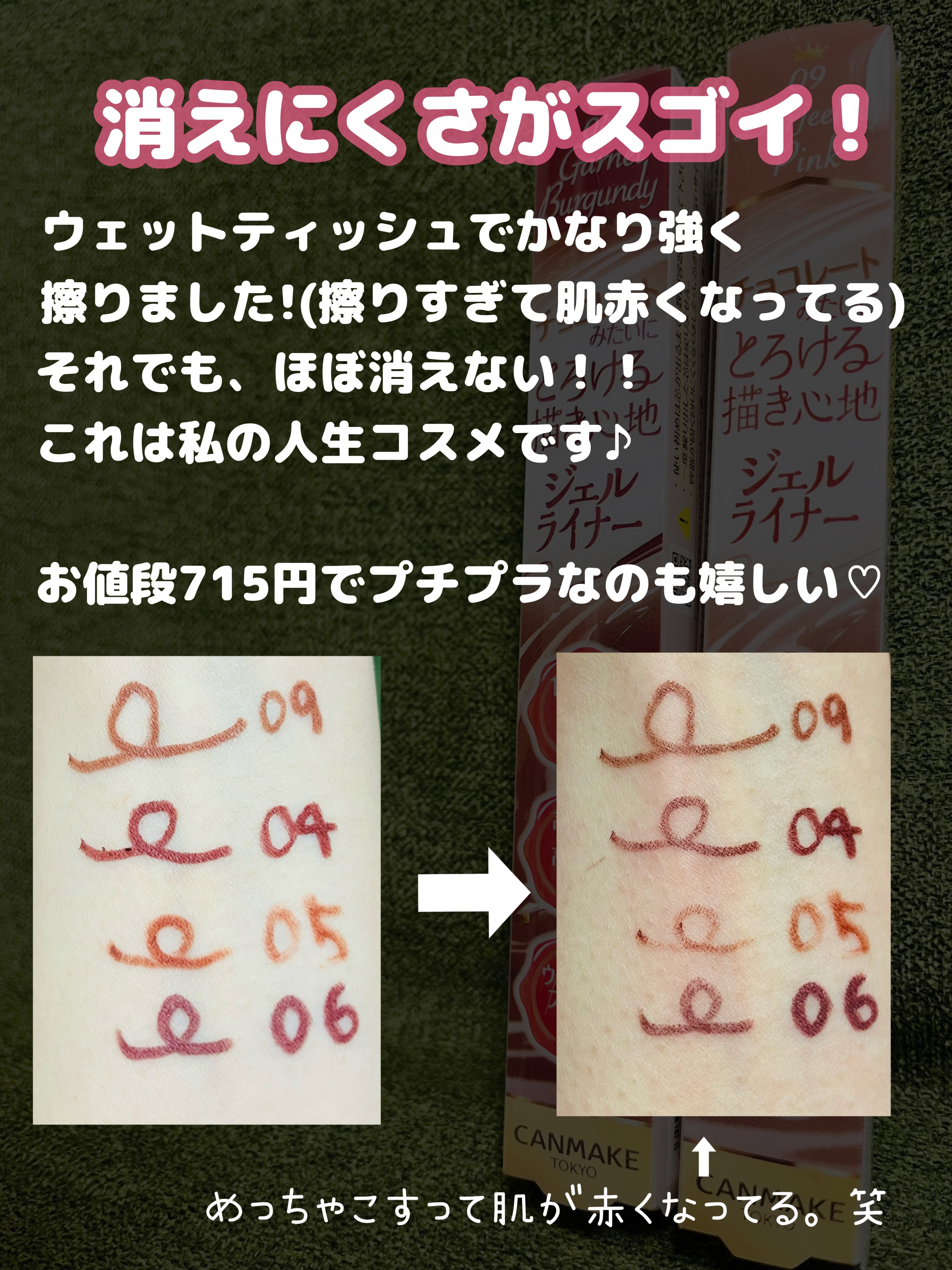 キャンメイククリーミータッチライナーお気に入り4色🫶🫶🫶スウォッチしたよ!下から順に02〜15!フラッシュなしありと、画像四枚目は化粧水ミストみたいなのを吹きかけてゴシゴシ擦った後の状態!逆にここまでしないと掠れないのすごい!🥹02ミディアム...