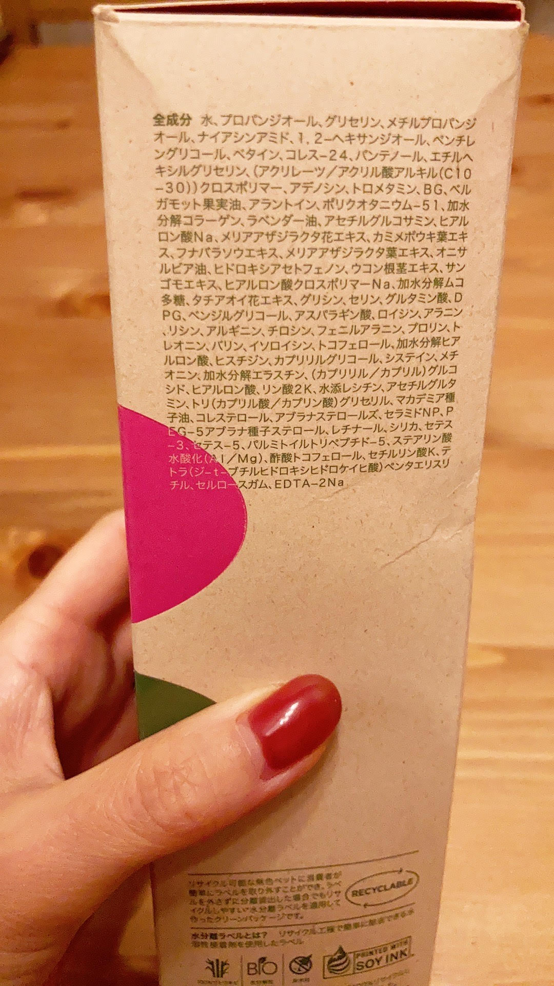 無色透明のややトロミのあるテクスチャーと、柑橘orハーブっぽい爽やかな香りで個人的に好み。 べたつきもそれほどなく、数分でスーッと浸透していくのが分かります! 少量でもよく伸びふっくらもちもちになります。 残った液は手に塗り込んで、乾燥&赤ぎれ防止に。
