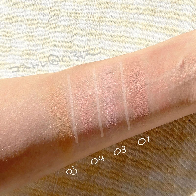 - <01 フォギーローズ> 窒化ホウ素、トリイソステアリン酸ポリグリセリル-2、リンゴ酸ジイソステアリル、ポリメチルシルセスキオキサン、ミリスチン酸亜鉛、ぺンチレングリコール、フェノキシエタノール、メチルパラベン、トコフェロール、スクワラン、オリーブ果実油、ホホバ種子油、マカデミア種子油、カニナバラ果実油、ジパルミチン酸アスコルビル、タルク、マイカ、酸化鉄、合成フルオロフロゴパイト、酸化チタン、グンジョウ、赤202、水酸化Al <02 シナモンブラウン> 窒化ホウ素、トリイソステアリン酸ポリグリセリル-2、リンゴ酸ジイソステアリル、ポリメチルシルセスキオキサン、ミリスチン酸亜鉛、ぺンチレングリコール、フェノキシエタノール、メチルパラベン、トコフェロール、スクワラン、オリーブ果実油、ホホバ種子油、マカデミア種子油、カニナバラ果実油、ジパルミチン酸アスコルビル、タルク、マイカ、酸化鉄、酸化チタン、合成フルオロフロゴパイト、赤226、水酸化Al <03 ミルクモーヴ> 窒化ホウ素、トリイソステアリン酸ポリグリセリル-2、リンゴ酸ジイソステアリル、ポリメチルシルセスキオキサン、ミリスチン酸亜鉛、ペンチレングリコール、フェノキシエタノール、メチルパラベン、トコフェロール、スクワラン、オリーブ果実油、ホホバ種子油、マカデミア種子油、カニナバラ果実油、ジパルミチン酸アスコルビル、タルク、マイカ、マンガンバイオレット、酸化チタン、酸化鉄、合成フルオロフロゴパイト、赤226、水酸化Al <04 ピュアピンク> 窒化ホウ素、トリイソステアリン酸ポリグリセリル-2、リンゴ酸ジイソステアリル、ポリメチルシルセスキオキサン、ミリスチン酸亜鉛、ペンチレングリコール、フェノキシエタノール、メチルパラベン、トコフェロール、スクワラン、オリーブ果実油、ホホバ種子油、マカデミア種子油、カニナバラ果実油、ジパルミチン酸アスコルビル、タルク、マイカ、酸化鉄、酸化チタン、合成フルオロフロゴパイト、グンジョウ、赤226、水酸化Al <05 メープルアプリコット> 窒化ホウ素、トリイソステアリン酸ポリグリセリル-2、リンゴ酸ジイソステアリル、ポリメチルシルセスキオキサン、ミリスチン酸亜鉛、ペンチレングリコール、フェノキシエタノール、メチルパラベン、トコフェロール、スクワラン、オリーブ果実油、ホホバ種子油、マカデミア種子油、カニナバラ果実油、ジパルミチン酸アスコルビル、タルク、マイカ、酸化鉄、酸化チタン、合成フルオロフロゴパイト、水酸化Al