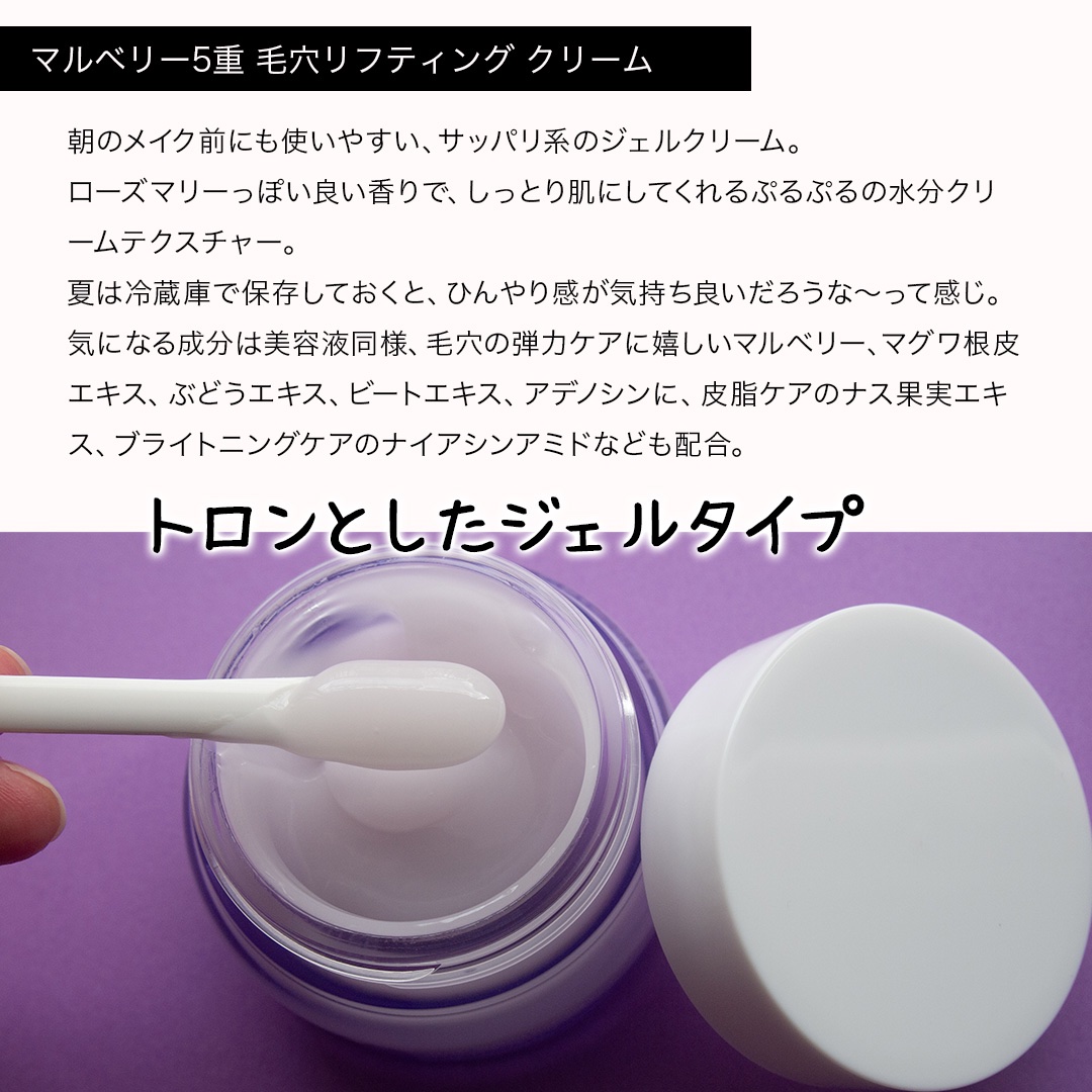 テクスチャーは、とってもみずみずしくクリーミー💧 香りは思っていたほど強くはなく、良い香りでテンション上がる感じ。 夜使うと朝までしっかり潤うし、ベッタベタって感じではないので、朝のメイク前でも少し時間をおけばメイクにも支障きたさない感じ🥰 低刺激で、肌タイプに反応してPHバランスを整えてくれるので、どんな肌タイプでも使えるのは良いですね😊✨ 保湿成分は、ヒアルロン酸、メドウラクトン、アクアクシル、セラミド、パンテノール💧 ニキビや肌荒れケアのジュニパーベリー、ツボ草エキス、アラントインが入ってます。あとは、抗シワで有名なマトリキシルの成分であるペプチドも1種配合なので、一応シワケアもできそうかな?