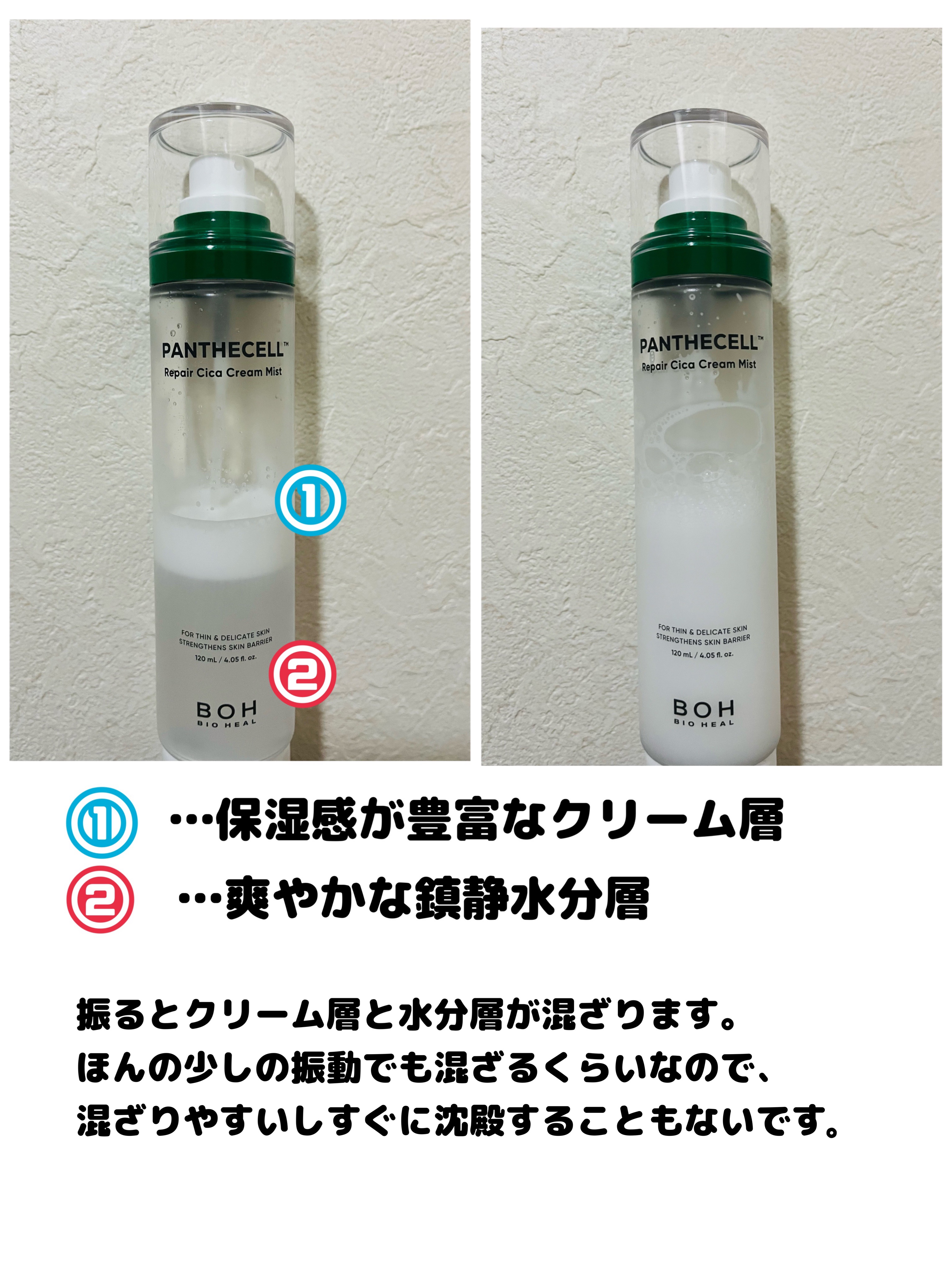 保湿クリーム層と水分層の二層になっていて振って使うミスト。 クリーム層の割合が過去商品より20%アップして 保湿力も高くなってます♡ 一回のプッシュで出るミストの量が多めで、しかも細かいから3プッシュくらいで潤う✨