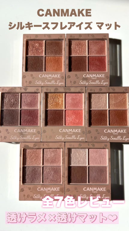 絶妙カラーの透けマットと繊細なキラキララメが可愛くてキャンメイクのシルキースフレアイズ(マットタイプ)全色集めちゃいました♡ シルキースフレアイズは透け感があるからムラになりにくく しっとり溶け込むようになじむふんわり軽い使用感なの。繊細なラメもキラキラで可愛いんだよね♡ 全色揃えても5000円以下だよ!可愛いから是非チェックしてみてね!