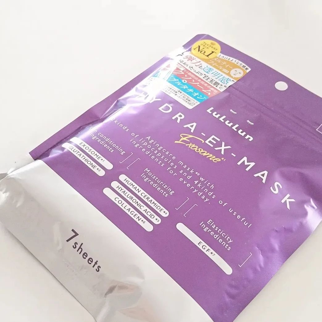 豪華な成分のシートマスク。整肌成分、日本製ヒト脂肪由来間葉系細胞エクソソーム/グルタチオン*1、ハリ成分EGF*2、保湿成分ヒト型セラミド*3/吸着型ヒアルロン酸*4/コラーゲン*5 肌にピタッと密着してくれて、ながら美容でもOK。剥がした後シートを絞るとたくさんの美容液が出てくる。 他のルルルンよりはちょっとお高いけど、それでも1枚100円くらいなのが嬉しい。
