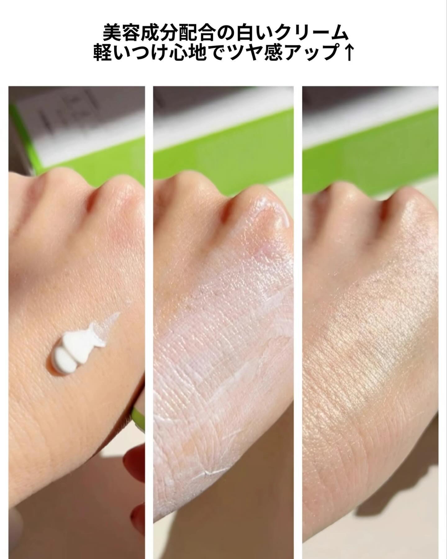 特徴 ・素肌みたいなナチュラル感 ・スキンケア、紫外線ケア、カバーができるオールインワンノンケミカルベース ・肌悩みで選べる6種 エッセンスタイプ SPF30 / PA++ ノンケミカル ♠ベージュ▸▸ ワントーン明るい肌へ、自然にカバー ♠ミント▸▸ 赤みが気になる肌に ♠ラベンダー▸▸ くすみが気になる肌に 〈クリームタイプ〉 SPF50 / PA++++ ノンケミカル ♠ベージュ▸▸ ワントーン明るい肌へ、自然にカバー ♠ピンク▸▸ 血色のないくすんだ肌に ♠イエロー▸▸ 赤みや色ムラが気になる肌に 使い心地や紫外線防御効果(SPF)をみても、これからの季節にはクリームタイプのほうが向いている気がします。