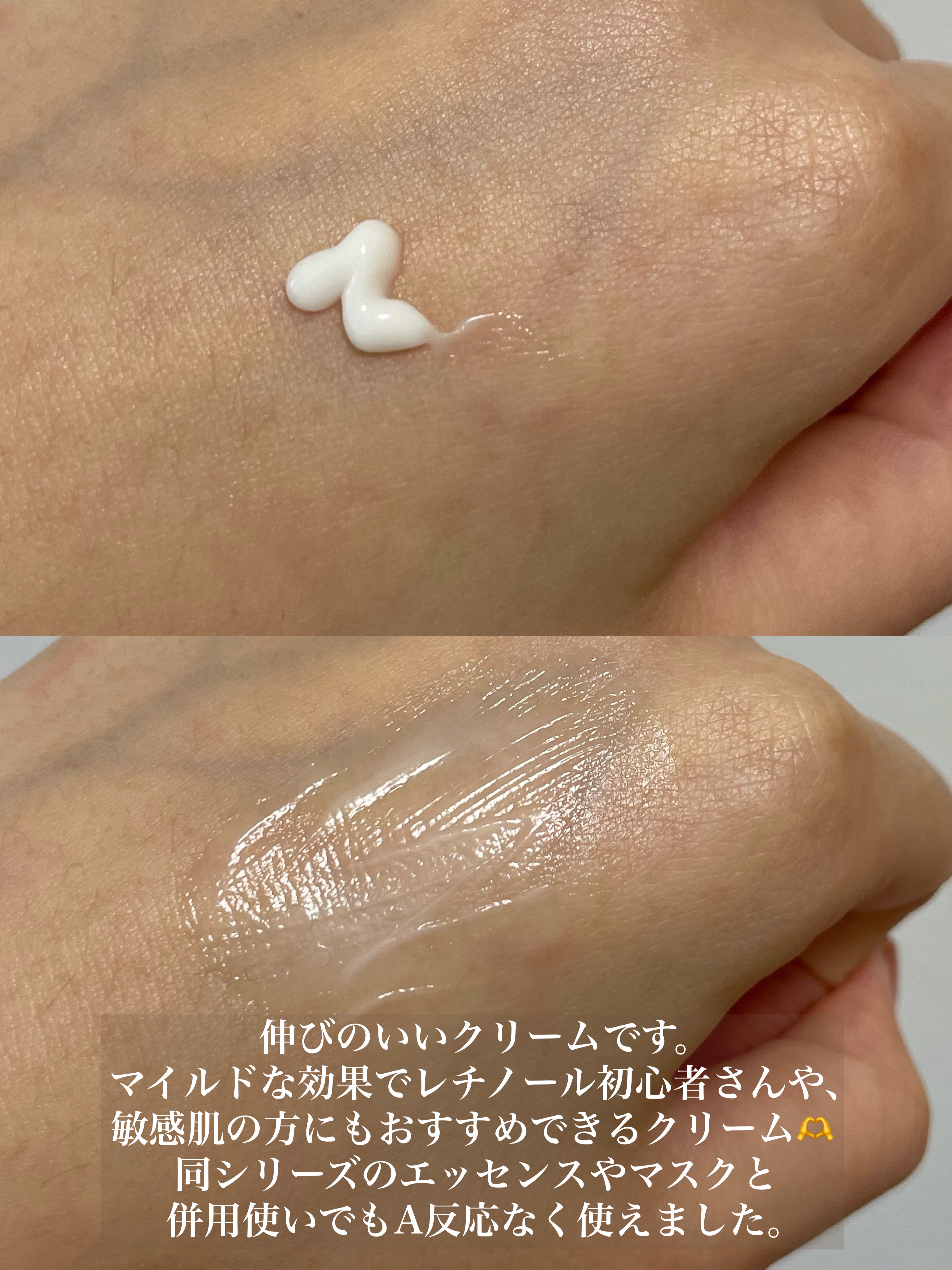 - 気になる部位にスポットケア - レチノールという整肌成分が初めての方でも使用可能◎ *パッケージのポイント! 先端部分が細くなっているため、使用量が調整しやすく簡単に使用できます。 クリームだからこそ初心者向け - 肌への負担を抑えながら毛穴へアプローチ ◎ 優しくとけ込み角質層隅々まで届く - 肌に馴染みやすいなめらかな使用感 ◎しっとり潤って密着し肌のキメを整えます。 ◎肌あれ予防ケア STEP1. 普段ご使用中のクリームに少量を混ぜて塗ってみてください。 STEP2. 肌が成分に慣れてきたら米粒ほどを手に取り気になる部分へクリームの段階で塗ってください。