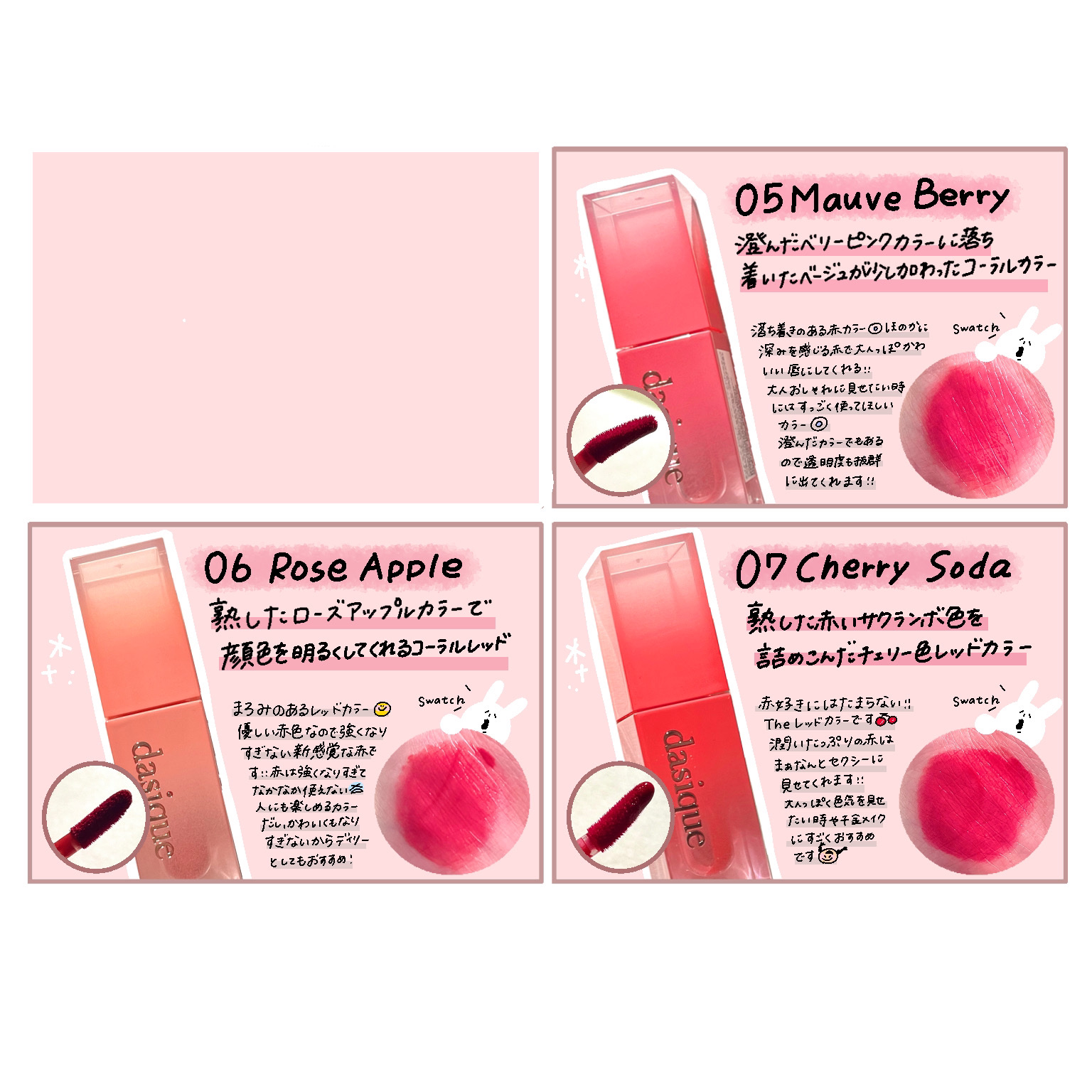 \ちゅるんちゅるんのピンクティント🩷/♡dasiqueJuicyDewyTint03PinkGuava肌に浮かない透明でラブリーな感じのピンクカラー。ブルベ夏向きカラーの、明るめピンク💖透明感たっぷりの鮮やかなカラーで、lovely感たっぷり...
