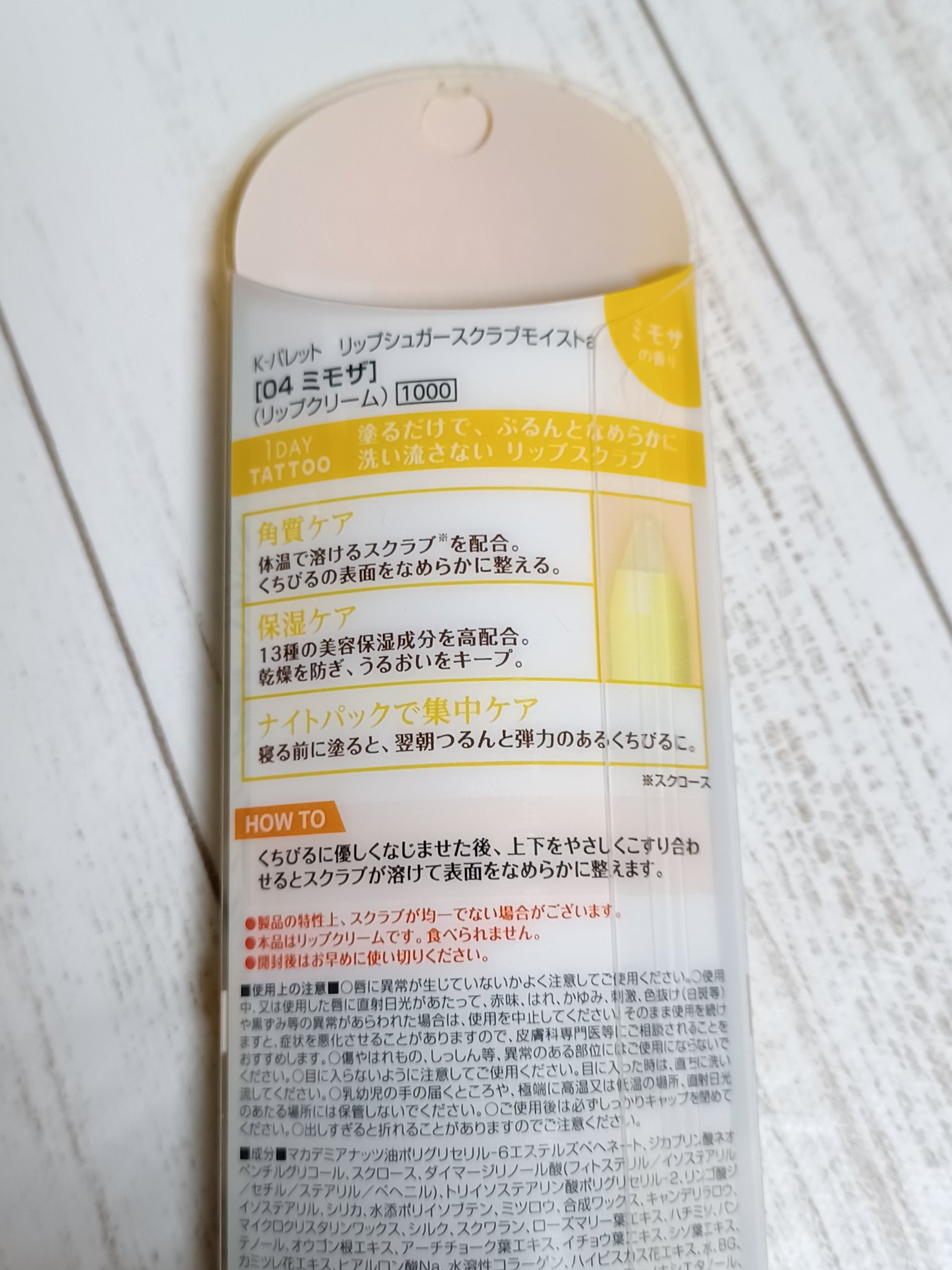 - 01 ピーチ マカデミアナッツ油ポリグリセリル-6エステルズベヘネート,ジカプリン酸ネオペンチルグリコール,スクロース,ダイマージリノール酸(フィトステリル/イソステアリル/セチル/ステアリル/ベヘニル),トリイソステアリン酸ポリグリセリル-2,リンゴ酸ジイソステアリル,シリカ,水添ポリイソブテン,ミツロウ,ポリエチレン,キャンデリラロウ,マイクロクリスタリンワックス,オウゴン根エキス,アーチチョーク葉エキス,イチョウ葉エキス,シソ葉エキス,カミツレ花エキス,ヒアルロン酸Na,水溶性コラーゲン,ハイビスカス花エキス,水,BG,スクワラン,エタノール,シメチコン,トコフェロール,クエン酸,クエン酸Na,メチルパラベン,フェノキシエタノール,香料 02 レモン マカデミアナッツ油ポリグリセリル-6エステルズベヘネート,ジカプリン酸ネオペンチルグリコール,スクロース,ダイマージリノール酸(フィトステリル/イソステアリル/セチル/ステアリル/ベヘニル),トリイソステアリン酸ポリグリセリル-2,リンゴ酸ジイソステアリル,シリカ,水添ポリイソブテン,ミツロウ,ポリエチレン,キャンデリラロウ,マイクロクリスタリンワックス,オウゴン根エキス,アーチチョーク葉エキス,イチョウ葉エキス,シソ葉エキス,カミツレ花エキス,ヒアルロン酸Na,水溶性コラーゲン,ハイビスカス花エキス,水,BG,スクワラン,エタノール,シメチコン,トコフェロール,クエン酸,クエン酸Na,メチルパラベン,フェノキシエタノール,レモン果皮油