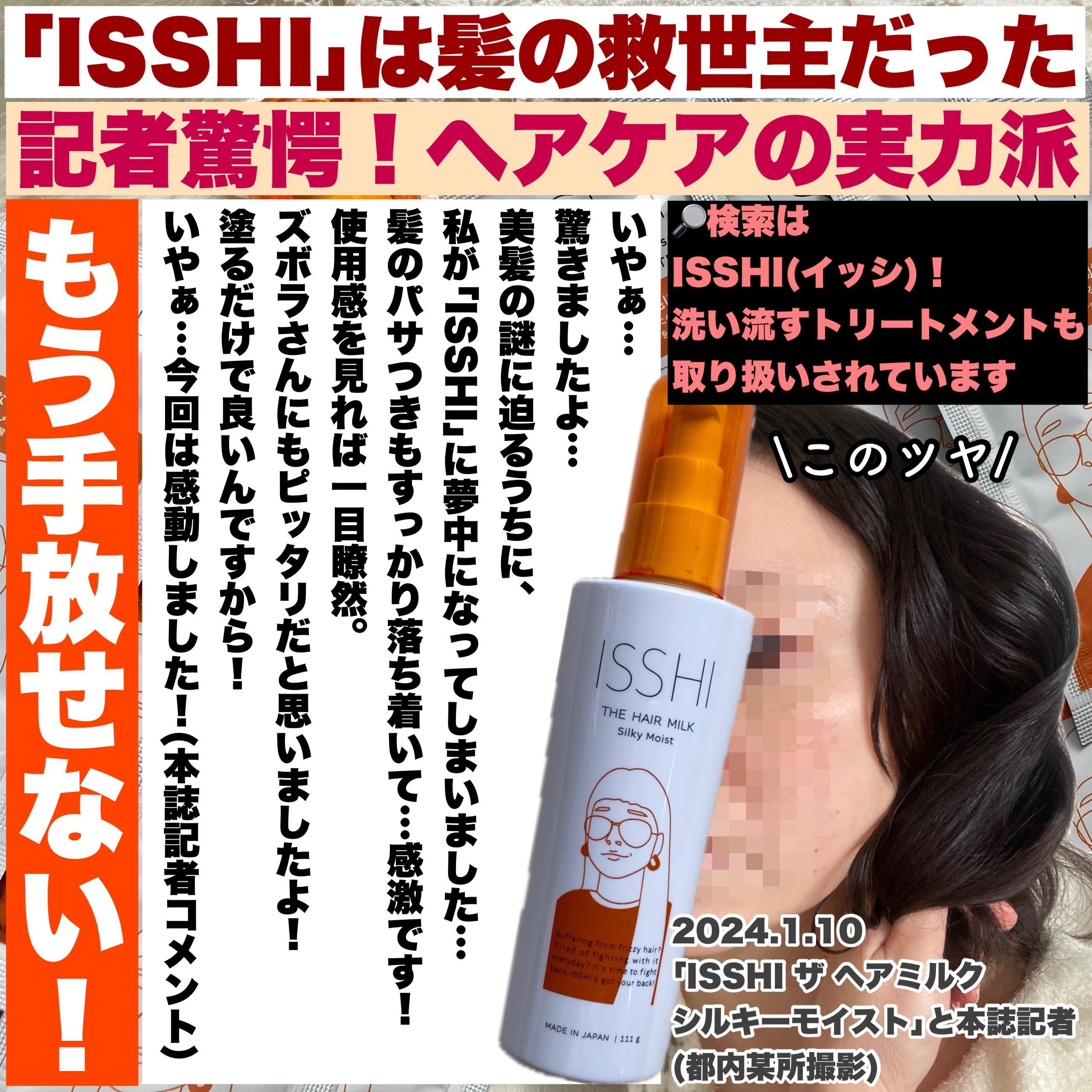 - 人気イッシ ザ ヘアミルクから、そのままでも詰め替えでも使えるパウチタイプが新登場。髪のうねり、広がり、ドライ、ダメージ毛等の手ごわい困り髪を、濃厚保湿×サロン品質の補修成分が、髪の芯まで浸透するアウトバストリートメント。 髪にしっとりうるおいを与えながら、ベタつくことなく指通りスムーズなしっとりさら髪へ。 みずみずしい上品な甘さ広がるピュアフラワーブーケの香り。