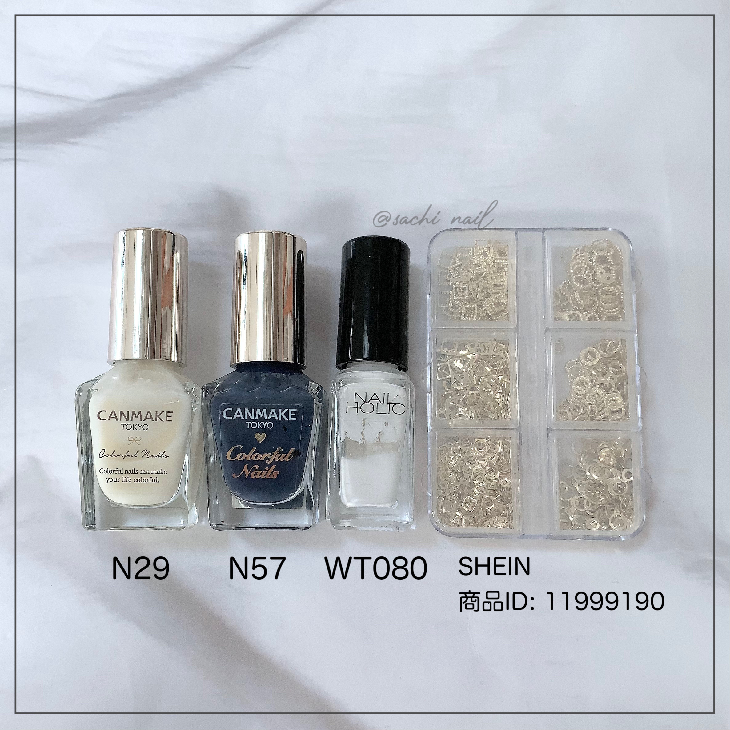 キャンメイクカラフルネイルズ N29ミルクシロップ N82クラウドレススカイ 親指、人差し指、小指は爪先にSV082で細いラインを描き、中指、薬指はAA225を重ねました。 ベースコート、トップコートはネイルホリックのものを使っています。
