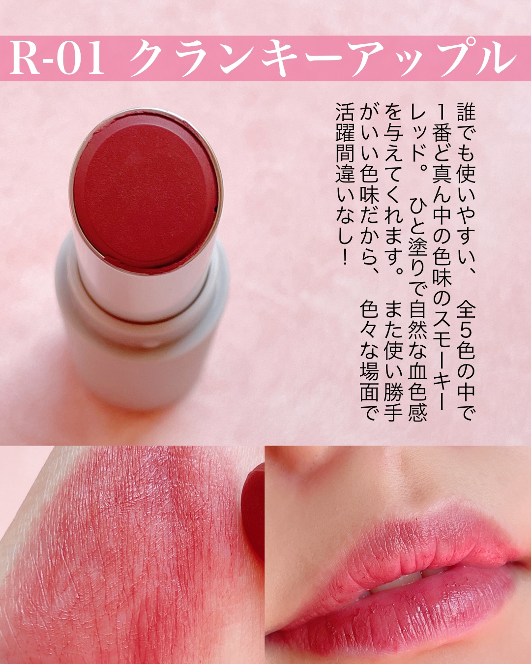 スルっと塗れる柔らかめな質感 乾燥しにくいですが、何度も塗り直す場合は保湿した方がいいと思います…! ソフトマットな仕上がりで、マットリップ苦手でも使いやすそうです◎ R-01は柔らかいレッドブラウン カラバリはくすんだ色が多く、おしゃれな色ばかりなのでおすすめです☻