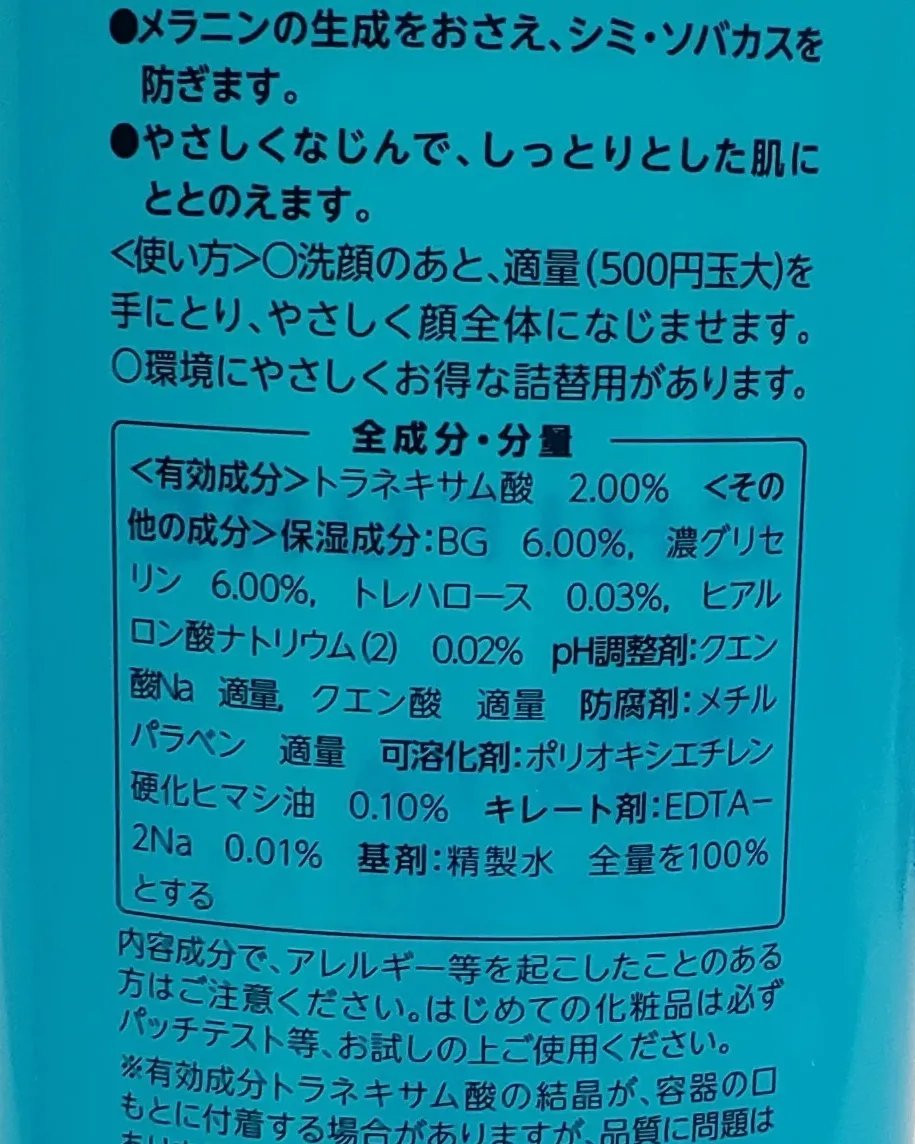 - <本品> 有効成分 トラネキサム酸 その他の成分 BG、濃グリセリン、トレハロース、ヒアルロン酸ナトリウム(2)、クエン酸Na、クエン酸、メチルパラベン、ポリオキシエチレン硬化ヒマシ油、EDTA-2Na、精製水 <詰替用> 有効成分 トラネキサム酸 その他の成分 BG、濃グリセリン、トレハロース、ヒアルロン酸ナトリウム(2)、クエン酸Na、クエン酸、メチルパラベン、ポリオキシエチレン硬化ヒマシ油、EDTA-2Na、精製水