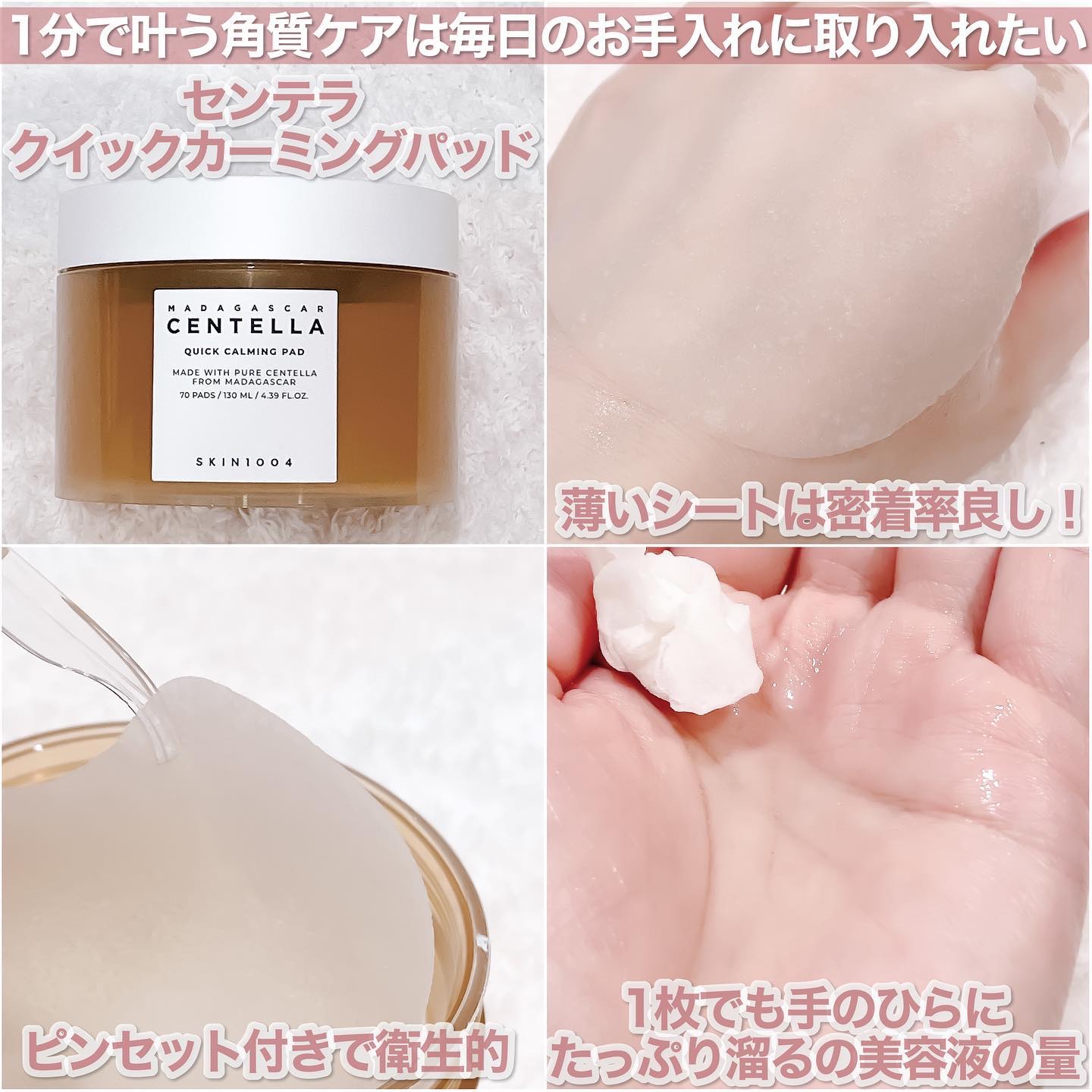 時間がない朝にも1分で水分チャージできる"じゅわぴたパッド"SKIN1004の「センテラクイックカーミングパッド」だよ刺激を受けたお肌にもやさしくケアできるSKIN1004のスキンケアが大好きで、このカーミングパッドもそのひとつ。パッドはお肌...