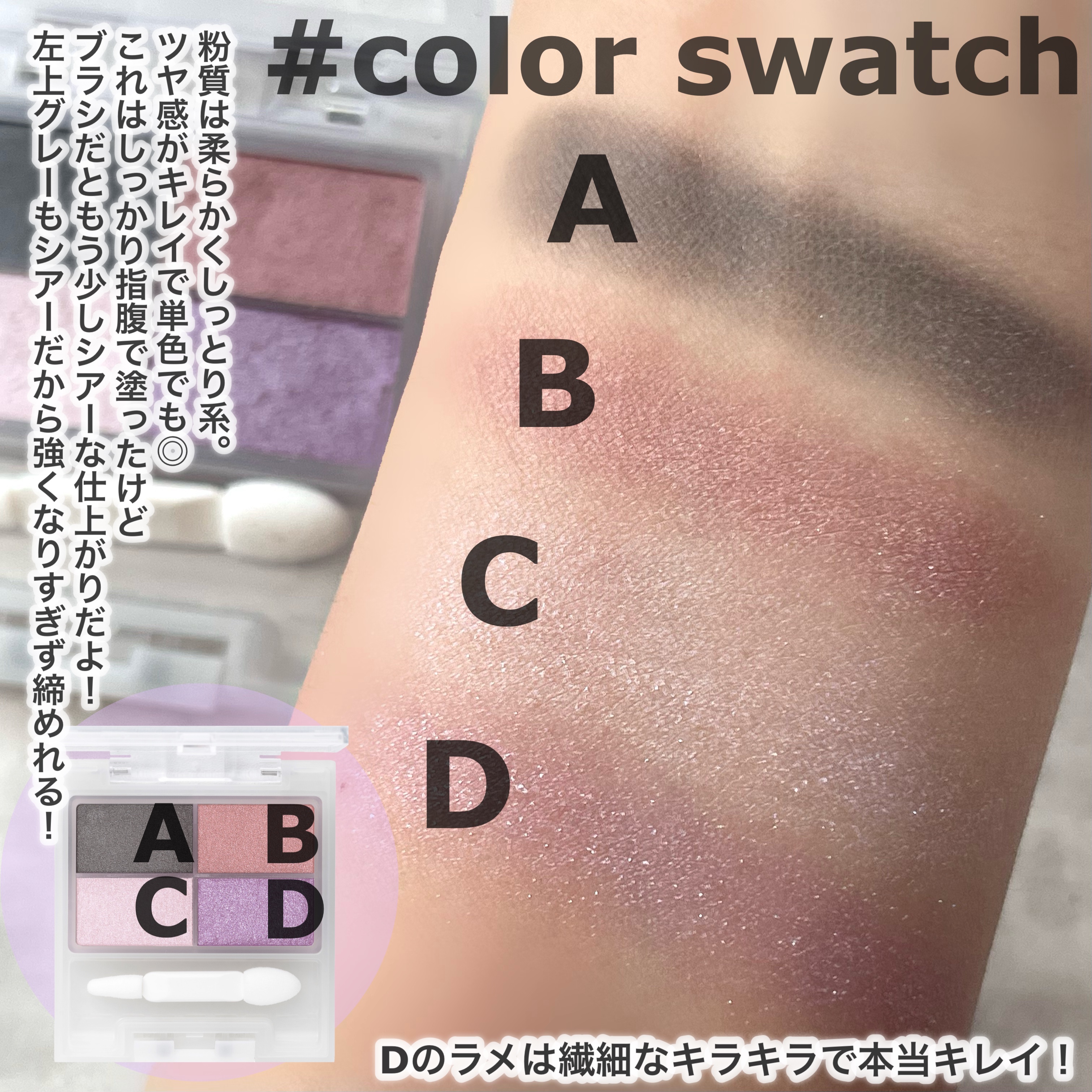 - シェードカラー・ミディアムカラー・ニュアンスカラー・スパークルカラーの4色が1つにまとまったメイクパレットです。 アイシャドウだけでなく、アイブロウやシェーディングとしても使えるカラーが入っているので、眉から目元まで、パレット1つでアイメイクが完成します。 カラーの組み合わせ次第でアレンジが広がり、様々なシーンに合わせたアイメイクを自在に楽しめます。 高密度ウレタン素材のチップ付きです。