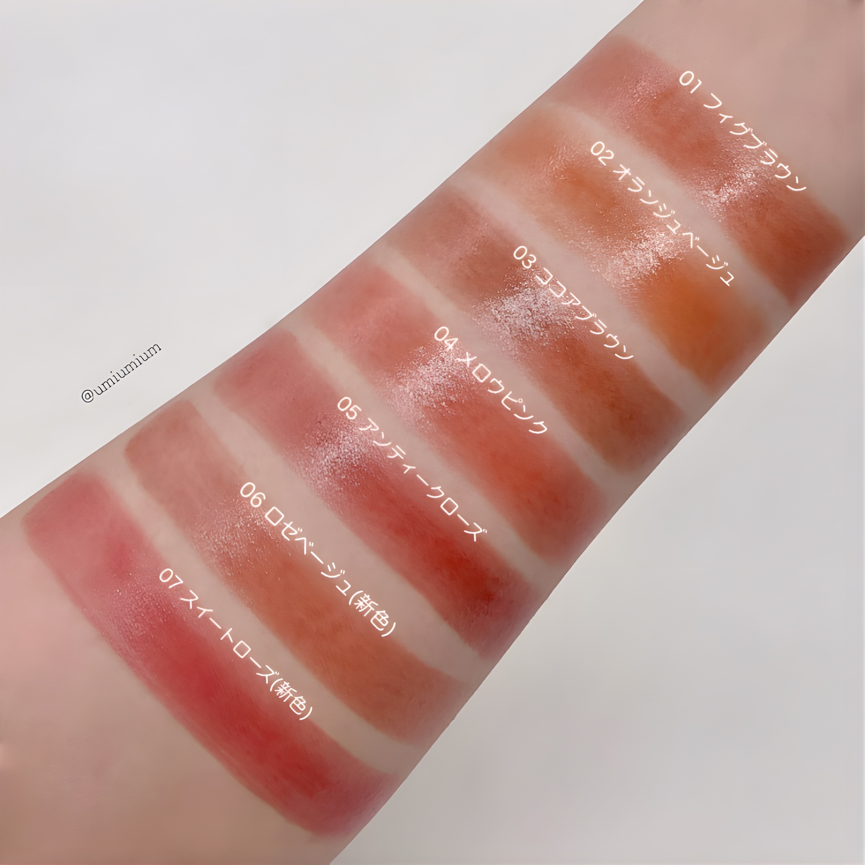 - <01 フィグブラウン> ジフェニルジメチコン、トリエチルヘキサノイン、トリ(カプリル酸/カプリン酸)グリセリル、PEGー12ジメチコン、ジフェニルシロキシフェニルトリメチコン、リンゴ酸ジイソステアリル、ポリエチレン、ペンタイソステアリン酸ジペンタエリスリチル、トリイソステアリン酸ポリグリセリルー2、ラウロイルグルタミン酸ジ(フィトステリル/オクチルドデシル)、合成ワックス、マイクロクリスタリンワックス、トコフェロール、アルガニアスピノサ核油、シア脂油、ホホバ種子油、ウラボシヤハズエキス、酸化チタン、酸化鉄、黄4、赤201、赤202、硫酸Ba、水酸化Al <02 オランジュベージュ> ジフェニルジメチコン、トリエチルヘキサノイン、トリ(カプリル酸/カプリン酸)グリセリル、PEGー12ジメチコン、ジフェニルシロキシフェニルトリメチコン、リンゴ酸ジイソステアリル、ポリエチレン、ペンタイソステアリン酸ジペンタエリスリチル、トリイソステアリン酸ポリグリセリルー2、ラウロイルグルタミン酸ジ(フィトステリル/オクチルドデシル)、合成ワックス、マイクロクリスタリンワックス、トコフェロール、アルガニアスピノサ核油、シア脂油、ホホバ種子油、ウラボシヤハズエキス、黄4、酸化鉄、酸化チタン、赤201、赤202、硫酸Ba、水酸化Al <03 ココアブラウン> ジフェニルジメチコン、トリエチルヘキサノイン、トリ(カプリル酸/カプリン酸)グリセリル、PEGー12ジメチコン、ジフェニルシロキシフェニルトリメチコン、リンゴ酸ジイソステアリル、ポリエチレン、ペンタイソステアリン酸ジペンタエリスリチル、トリイソステアリン酸ポリグリセリルー2、ラウロイルグルタミン酸ジ(フィトステリル/オクチルドデシル)、合成ワックス、マイクロクリスタリンワックス、トコフェロール、アルガニアスピノサ核油、シア脂油、ホホバ種子油、ウラボシヤハズエキス、酸化鉄、酸化チタン、黄4、赤201、赤202、硫酸Ba、水酸化Al <04 メロウピンク> ジフェニルジメチコン、トリエチルヘキサノイン、トリ(カプリル酸/カプリン酸)グリセリル、PEGー12ジメチコン、ジフェニルシロキシフェニルトリメチコン、リンゴ酸ジイソステアリル、ポリエチレン、ペンタイソステアリン酸ジペンタエリスリチル、トリイソステアリン酸ポリグリセリルー2、ラウロイルグルタミン酸ジ(フィトステリル/オクチルドデシル)、合成ワックス、マイクロクリスタリンワックス、トコフェロール、アルガニアスピノサ核油、シア脂油、ホホバ種子油、ウラボシヤハズエキス、酸化チタン、酸化鉄、黄4、赤201、赤202、硫酸Ba、水酸化Al <05 アンティークローズ> ジフェニルジメチコン、トリエチルヘキサノイン、トリ(カプリル酸/カプリン酸)グリセリル、PEGー12ジメチコン、ジフェニルシロキシフェニルトリメチコン、リンゴ酸ジイソステアリル、ポリエチレン、ペンタイソステアリン酸ジペンタエリスリチル、トリイソステアリン酸ポリグリセリルー2、ラウロイルグルタミン酸ジ(フィトステリル/オクチルドデシル)、合成ワックス、マイクロクリスタリンワックス、トコフェロール、アルガニアスピノサ核油、シア脂油、ホホバ種子油、ウラボシヤハズエキス、酸化鉄、酸化チタン、黄4、赤201、赤202、硫酸Ba、水酸化Al <06 ロゼベージュ> ジフェニルジメチコン、トリエチルヘキサノイン、トリ(カプリル酸/カプリン酸)グリセリル、PEG―12ジメチコン、ジフェニルシロキシフェニルトリメチコン、リンゴ酸ジイソステアリル、ポリエチレン、ペンタイソステアリン酸ジペンタエリスリチル、トリイソステアリン酸ポリグリセリル-2、ラウロイルグルタミン酸ジ(フィトステリル/オクチルドデシル)、合成ワックス、マイクロクリスタリンワックス、トコフェロール、アルガニアスピノサ核油、シア脂油、ホホバ種子油、ウラボシヤハズエキス、酸化チタン、酸化鉄、黄4、赤201、赤202、硫酸Ba、水酸化Al <07 スイートローズ> ジフェニルジメチコン、トリエチルヘキサノイン、トリ(カプリル酸/カプリン酸)グリセリル、PEG―12ジメチコン、ジフェニルシロキシフェニルトリメチコン、リンゴ酸ジイソステアリル、ポリエチレン、ペンタイソステアリン酸ジペンタエリスリチル、トリイソステアリン酸ポリグリセリル-2、ラウロイルグルタミン酸ジ(フィトステリル/オクチルドデシル)、合成ワックス、マイクロクリスタリンワックス、トコフェロール、アルガニアスピノサ核油、シア脂油、ホホバ種子油、ウラボシヤハズエキス、酸化チタン、酸化鉄、黄4、赤201、赤202、硫酸Ba、水酸化Al <08 チェリーレッド> ジフェニルジメチコン、トリエチルヘキサノイン、トリ(カプリル酸/カプリン酸)グリセリル、PEG-12ジメチコン、ジフェニルシロキシフェニルトリメチコン、リンゴ酸ジイソステアリル、ポリエチレン、ペンタイソステアリン酸ジペンタエリスリチル、トリイソステアリン酸ポリグリセリル-2、ラウロイルグルタミン酸ジ(フィトステリル/オクチルドデシル)、合成ワ