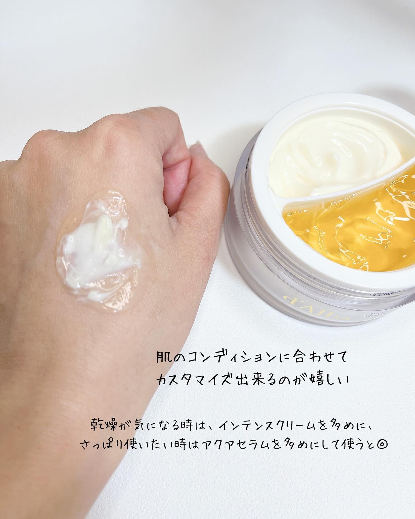 - アクサセラムとインテンスクリームのデュアル・フォーミュラで肌のタイプやコンディションに合わせて 比率を調節してカスタマイズ・ケアします。 ・アクアセラム:ヒアルロン酸、パンテノール、ツボクサエキス*が含まれた、さっぱりとした使用感で肌に水分を与え肌のキメを整えます。*ヒアルロン酸・パンテノール・ツボクサエキス(いずれも保湿成分) ・インテンスクリーム:イタリア産ホワイトトリュフ*が含まれた、もっちりした使用感で肌にうるおいを与えツヤのあるもち肌へ導きます。*ツベルマグナツムエキス(保湿成分) イタリアヴィーガン認証V-LABEL取得 皮膚低刺激テスト済み *全ての方に皮膚刺激が発生しないということではありません。 【使い方】 1. 洗顔後、スパチュラで肌のコンディションによって、セーラムとクリームを適量を取り、 ミックスしてから顔全体に優しく塗り広げ、 吸収させます。※ 必要に応じて、アクアセラムとインテンスクリームは単品でも使用できます。 【使用上の注意】 お肌に異常が生じていないかよく注意して使用してください。化粧品がお肌に合わないとき即ち次のような場合には、使用を中止してください。そのまま使用を続けますと、症状を悪化させることがありますので、皮ふ科専門医等にご相談されることをおすすめします。 (1)使用中、赤味、はれ、かゆみ、刺激、色抜け(白斑等)や黒ずみ等の異常があらわれた場合 (2)使用したお肌に、直射日光があたって(1)のような異常があらわれた場合