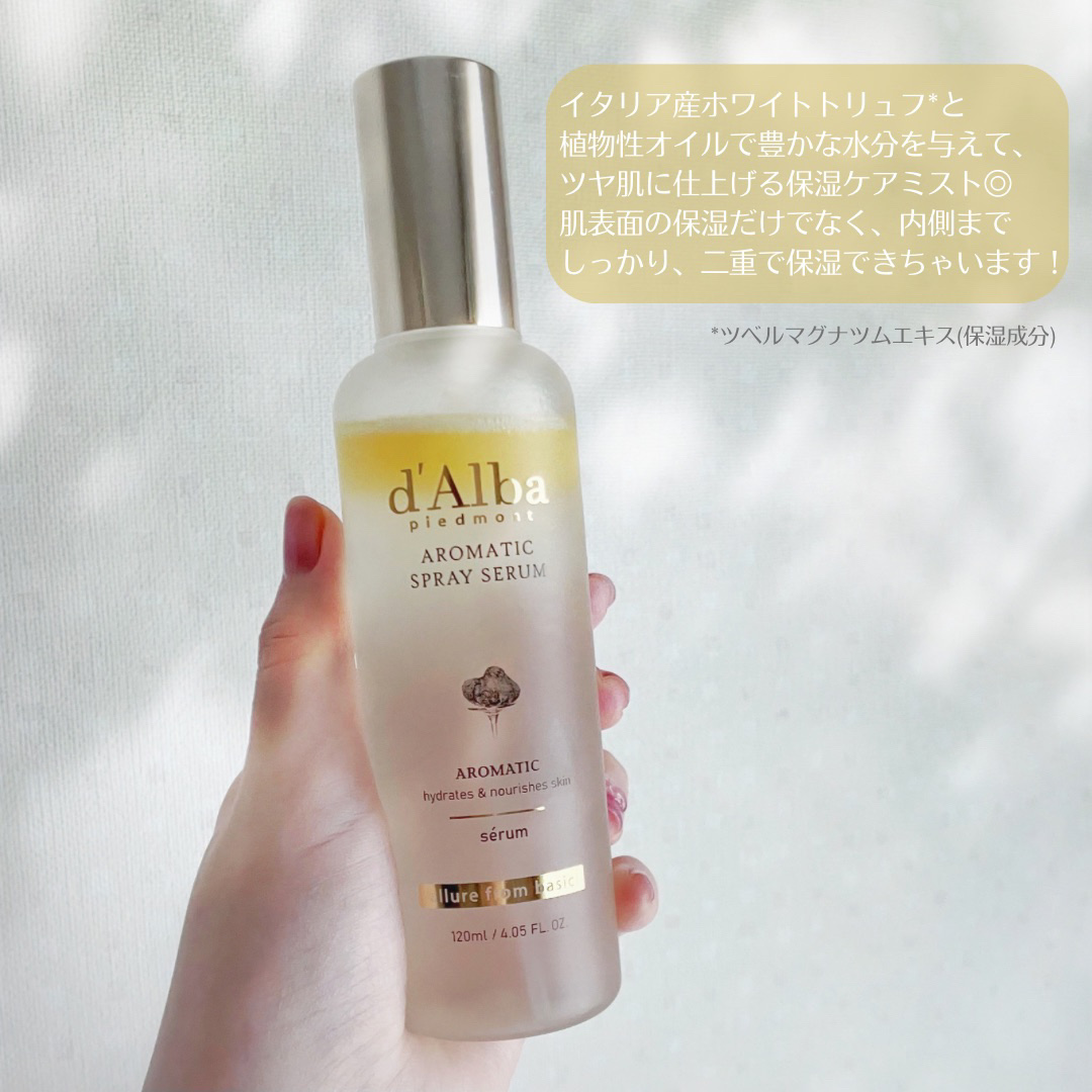【d’Albaホワイトトリュフファーストスプレーセラム】[オイル×美容液]の2層タイプオイルが乾燥から守ってくれる♡それにしても、とにかくミストが細かい!つけてる感じがない程に!なのにちゃんと潤ってくれる素晴らしさ✨スプレーするだけで、美容液...
