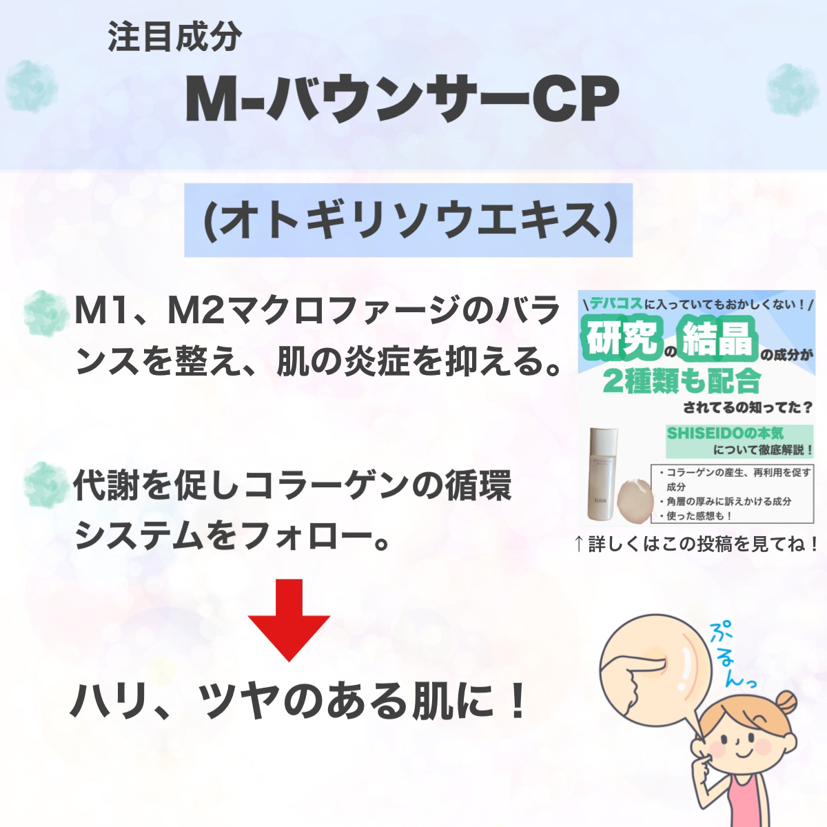 - ■商品特長 (医薬部外品) エリクシール 美白※3 &エイジングケア※2 世界初の光解析システム※4 の知見に着目。 透明感とハリに満ちた「つや玉」続く肌へ導く、薬用美白化粧水 ※2 エイジングケアとは、年齢に応じたうるおいケアです。 ※3 美白美白化粧品は、メラニンの生成を抑え、シミ・ソバカスを防ぎます。 ※4 肌からのすべての光を分離計測し、視覚的に詳細に解析できる技術が世界初である。クラリベイト社調べ(2022年9月) ○厳選された美容成分配合で、肌にハリを与えながら、浸透処方で角層深くまでうるおいを届けます。 ○透明感とハリに満ちた「つや玉」が輝き続ける肌へ導きます。 -美白有効成分 4MSK(4-メトキシサリチル酸カリウム塩)配合 -薬用有効成分 グリチルリチン酸ジカリウム(肌あれを防ぐ)配合 -厳選成分 ディープモイストインCP(メリロートエキス、グリセリン:保湿)配合 -コラーゲンGL(水溶性コラーゲン、グリセリン:保湿)配合 -厳選成分 M-バウンサーCP(オトギリソウエキス、グリセリン:ハリ保湿)配合 ○リラックス感のある心地よいアクアフローラルの香りです。 ○乾燥による小じわを目立たなくします。(効能評価試験済み) ○アレルギーテスト済み (全てのかたにアレルギーが起きないというわけではありません)。 ■テクスチャー(使用感) Ⅱ:なめらかにうるおう しっとりタイプ