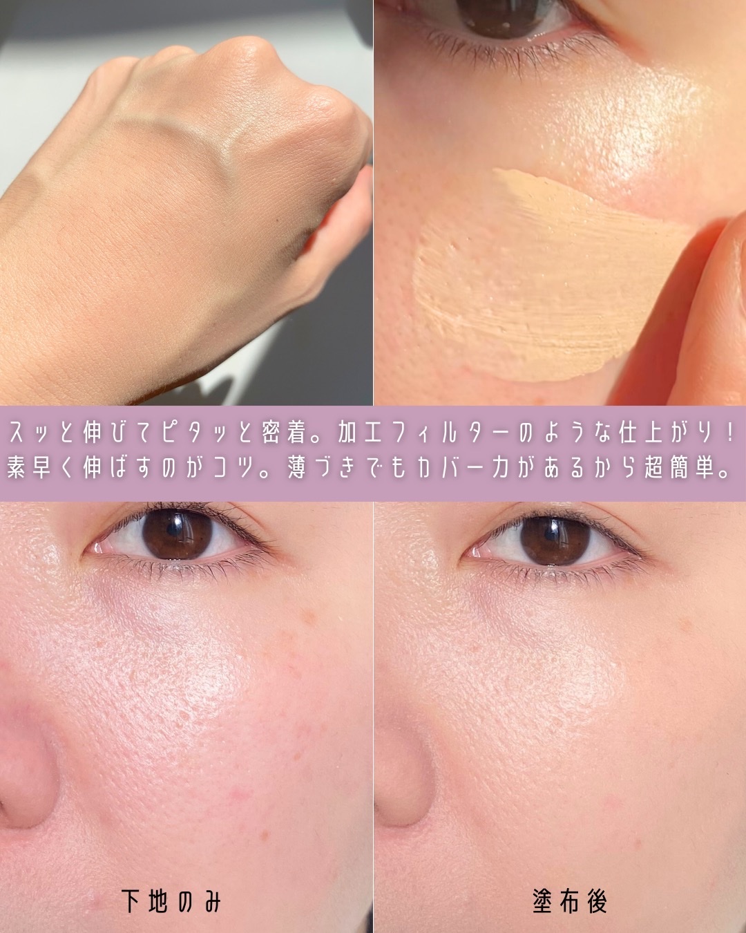 - 超うす膜なのに、崩れにくい。 全瞬間ビジュがいい。 1. 超うす膜が、ぴたっと密着 軽い微粒子が薄膜を作り、スーッと伸びて肌と一体化するように密着する、 「リアルスキンフィルム処方」を採用。 だから、時間がたっても、崩れにくい。 なのに、心地よさつづく。 2.毛穴レス*1で、透明感のある肌*2 薄膜なのに毛穴・くすみはぼかし、きめ細かく透けるような肌*1へ。 「ナイアシンアミド配合」*3 全6色展開 *1メイクアップ効果により毛穴をカバーすること *2メイクアップ効果による *3保湿効果 ※2026年2月10日〜パッケージリニューアル