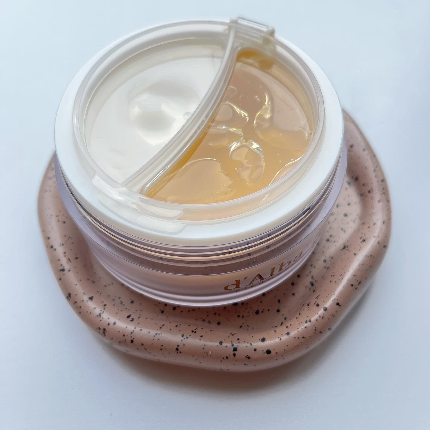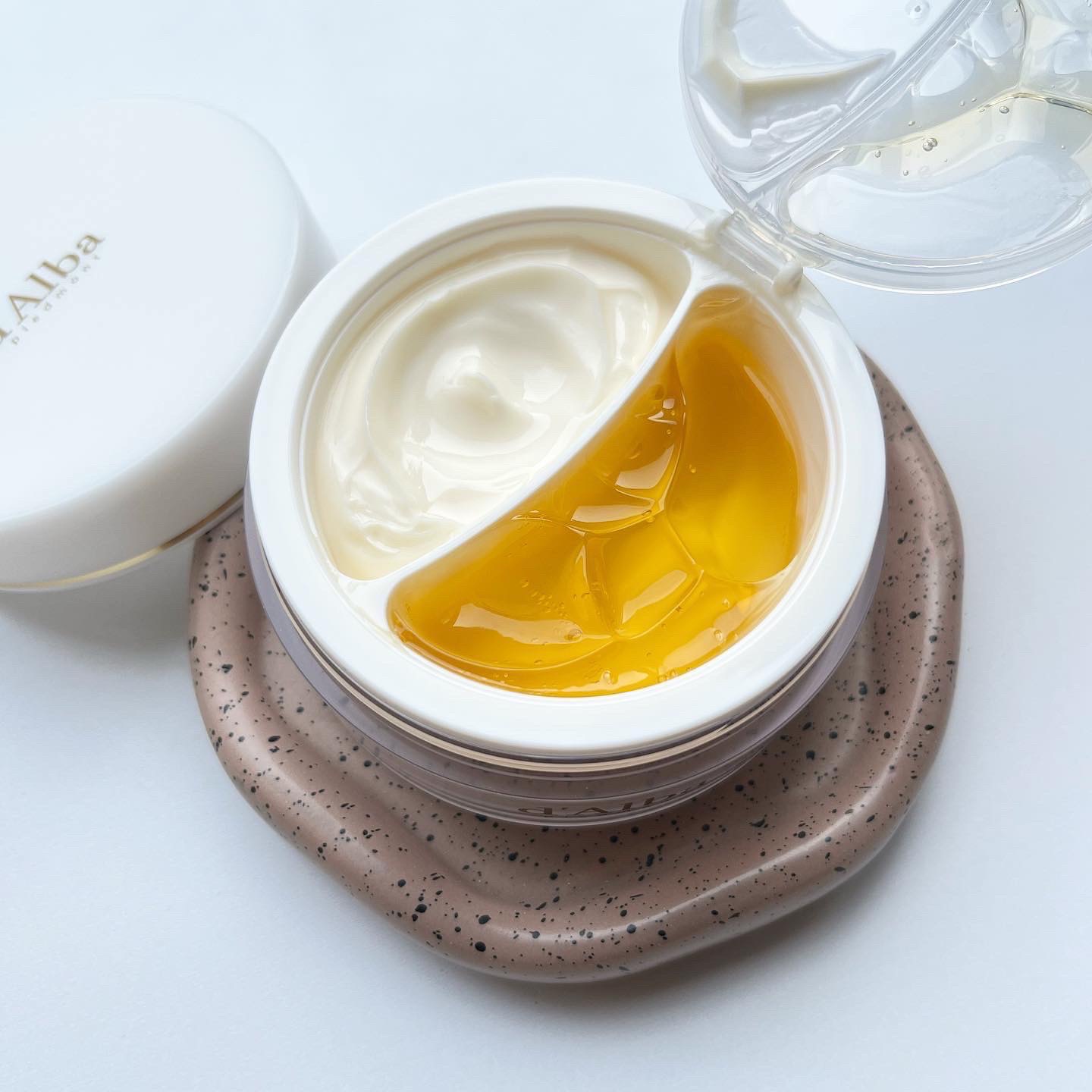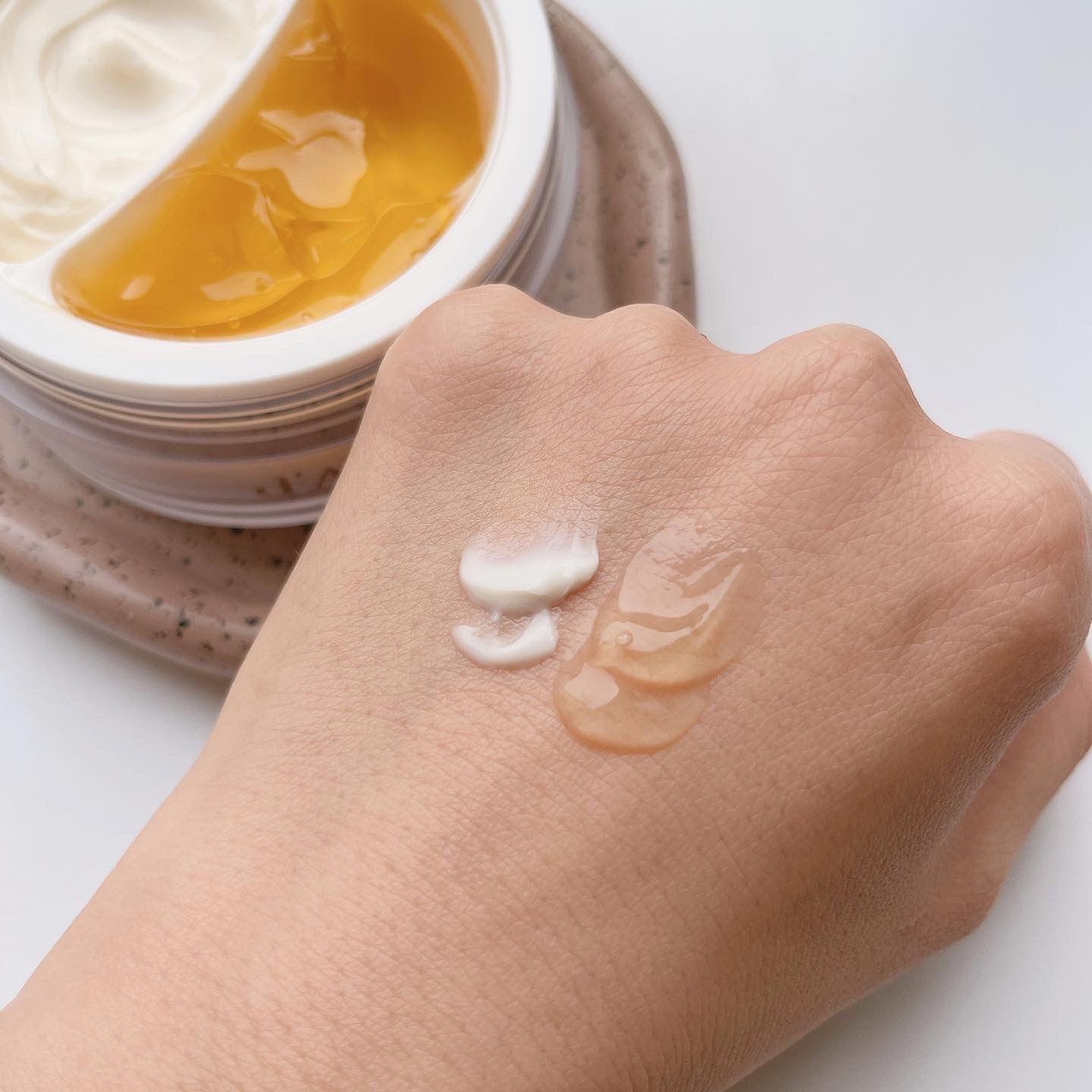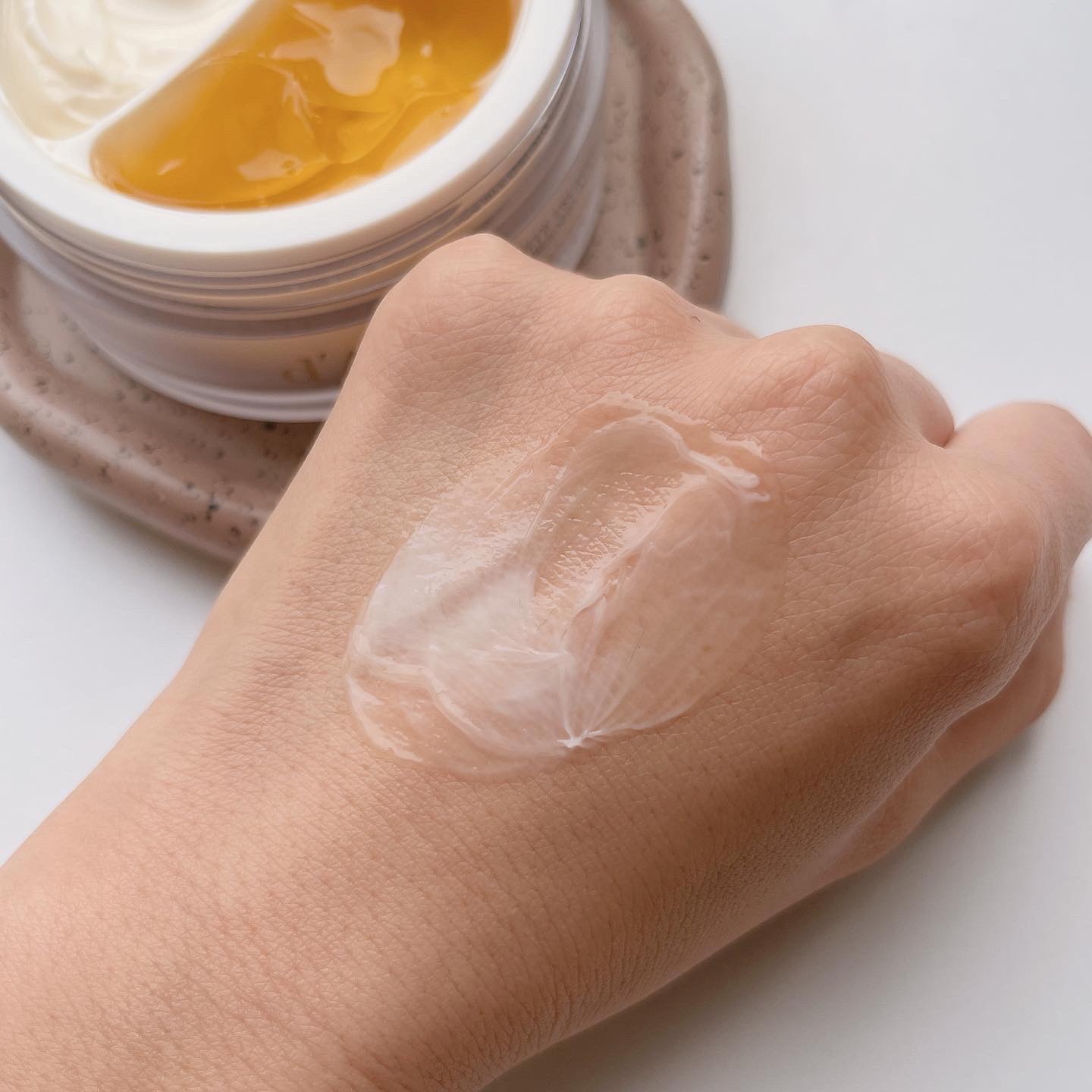 肌に水分をたっぷり与えてくれる黄色のアクアセラムと、肌の弾力をしっかりサポートしてくれる白色のインテンスクリームを組み合わせたクリーム✨ アクアセラムは軽やかなジェル状で、みずみずしい塗り心地です 2種類のクリームを合わせて使うと保湿されつつもべたつかない使用感😍✨