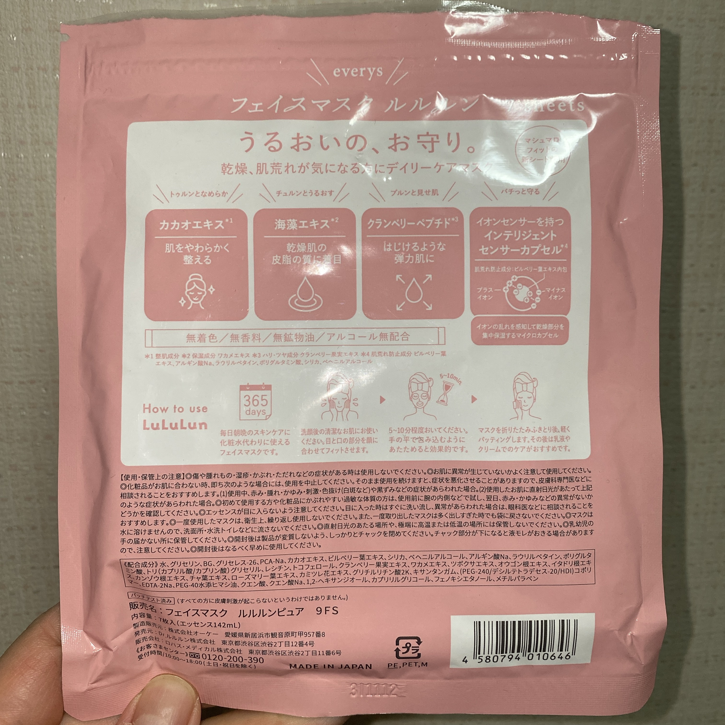 - <ルルルンピュア エブリーズ 32枚入> 水、グリセリン、BG、グリセレス-26、PCA-Na、カカオエキス、ビルベリー葉エキス、シリカ、ベヘニルアルコール、アルギン酸Na、ラウリルベタイ ン、ポリグルタミン酸、トリ(カプリル酸/カプリン酸)グリセリル、レシチン、トコフェロール、クランベリー果実エキス、ワカメエキス、ツボクサエキス、オウ ゴン根エキス、イタドリ根エキス、カンゾウ根エキス、チャ葉エキス、ローズマリー葉エキス、カミツレ花エキス、グリチルリチン酸2K、キサンタンガム、(PEG240/デシルテトラデセス-20/HDI)コポリマー、EDTA-2Na、PEG-40水添ヒマシ油、クエン酸、クエン酸Na、1,2-へキサンジオール、カプリリルグリコール、フェノキ シエタノール、メチルパラベン <ルルルンピュア エブリーズ 7枚入> 水、グリセリン、BG、グリセレス-26、PCA-Na、カカオエキス、ビルベリー葉エキス、シリカ、ベヘニルアルコール、アルギン酸Na、ラウリルベタイ ン、ポリグルタミン酸、トリ(カプリル酸/カプリン酸)グリセリル、レシチン、トコフェロール、クランベリー果実エキス、ワカメエキス、ツボクサエキス、オウ ゴン根エキス、イタドリ根エキス、カンゾウ根エキス、チャ葉エキス、ローズマリー葉エキス、カミツレ花エキス、グリチルリチン酸2K、キサンタンガム、(PEG240/デシルテトラデセス-20/HDI)コポリマー、EDTA-2Na、PEG-40水添ヒマシ油、クエン酸、クエン酸Na、1,2-へキサンジオール、カプリリルグリコール、フェノキ シエタノール、メチルパラベン <ルルルンピュア ピンク(バランス) 7枚入【旧】> 水、グリセリン、BG、PCA-Na、グリチルリチン酸2K、ビルベリー葉エキス、シャクヤク花エキス、クランベリー果実エキス、乳酸桿菌発酵液、バチルス発酵物、レシチン、シトステロール、パルミチン酸アスコルビル、グルコノラクトン、グルタミン酸ジ酢酸4Na、ベンジルアルコール、アルギン酸Na、ラウリルベタイン、ポリグルタミン酸、シリカ、ベヘニルアルコール、水酸化Na、PEG-40水添ヒマシ油、キサンタンガム、クエン酸、クエン酸Na、フェノキシエタノール、メチルパラベン <ルルルンピュア ピンク(バランス) 36枚入【旧】> 水、グリセリン、BG、PCA-Na、グリチルリチン酸2K、ビルベリー葉エキス、シャクヤク花エキス、クランベリー果実エキス、乳酸桿菌発酵液、バチルス発酵物、レシチン、シトステロール、パルミチン酸アスコルビル、グルコノラクトン、グルタミン酸ジ酢酸4Na、ベンジルアルコール、アルギン酸Na、ラウリルベタイン、ポリグルタミン酸、シリカ、ベヘニルアルコール、水酸化Na、PEG-40水添ヒマシ油、キサンタンガム、クエン酸、クエン酸Na、フェノキシエタノール、メチルパラベン