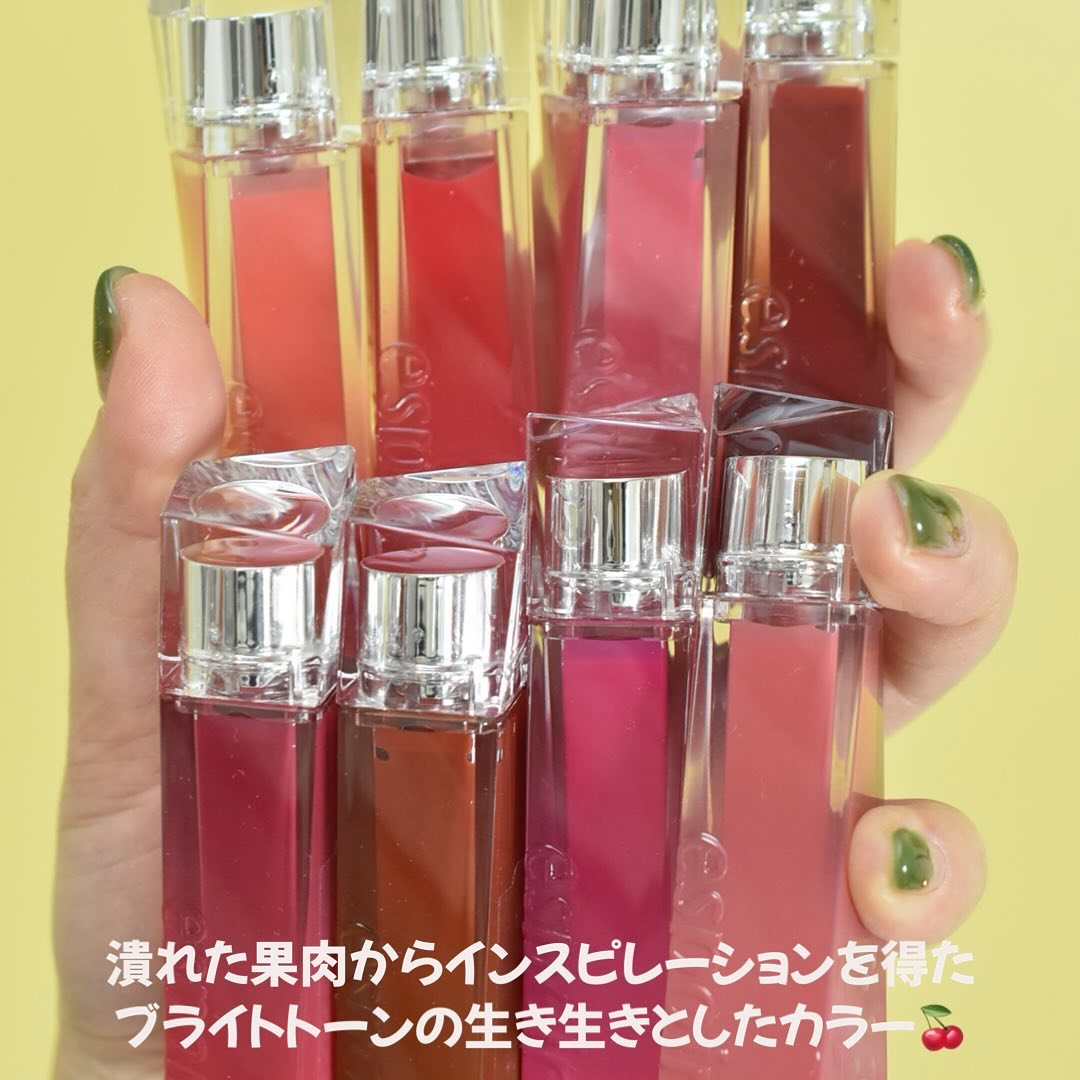 - <アップルシャーベット> 水、リンゴ酸ジイソステアリル、ビスジグリセリルポリアシルアジペート-2、ダイマージリノール酸ダイマージリノレイルビス(ベヘニル/イソステアリル/フィトステリル)、水添ポリイソブテン、ジグリセリン、ジフェニルジメチコン、セチルPEG/PPG-10/1ジメチコン、トリメチルシロキシフェニルジメチコン、ポリソルベート60、ペンチレングリコール、イソステアリン酸ソルビタン、イソステアリン酸ポリグリセリル-4、フェノキシエタノール、(アクリル酸ヒドロキシエチル/アクリロイルジメチルタウリンNa)コポリマー、セテアレス-20、スクワラン、香料、ジラウラミドグルタミドリシンNa、エチルヘキシルグリセリン、エチレンジアミンジコハク酸3Na、黄5、赤227、赤104(1)、黄4 <オッドコーラル> 水、リンゴ酸ジイソステアリル、ダイマージリノール酸ダイマージリノレイルビス(ベヘニル/イソステアリル/フィトステリル)、ビスジグリセリルポリアシルアジペート-2、水添ポリイソブテン、ジフェニルジメチコン、ジグリセリン、セチルPEG/PPG-10/1ジメチコン、トリメチルシロキシフェニルジメチコン、ポリソルベート60、ペンチレングリコール、イソステアリン酸ソルビタン、イソステアリン酸ポリグリセリル-4、フェノキシエタノール、セテアレス-20、(アクリル酸ヒドロキシエチル/アクリロイルジメチルタウリンNa)コポリマー、スクワラン、香料、ジラウラミドグルタミドリシンNa、エチルヘキシルグリセリン、エチレンジアミンジコハク酸3Na、水酸化Al、ポリアクリル酸アンモニウム、BG、酸化チタン、黄5、赤104(1)、黄4、赤227、青1 <チリンチリン> 水、リンゴ酸ジイソステアリル、ダイマージリノール酸ダイマージリノレイルビス(ベヘニル/イソステアリル/フィトステリル)、ビスジグリセリルポリアシルアジペート-2、水添ポリイソブテン、ジグリセリン、ジフェニルジメチコン、セチルPEG/PPG-10/1ジメチコン、トリメチルシロキシフェニルジメチコン、ポリソルベート60、ペンチレングリコール、イソステアリン酸ソルビタン、イソステアリン酸ポリグリセリル-4、フェノキシエタノール、セテアレス-20、(アクリル酸ヒドロキシエチル/アクリロイルジメチルタウリンNa)コポリマー、スクワラン、香料、ジラウラミドグルタミドリシンNa、エチルヘキシルグリセリン、エチレンジアミンジコハク酸3Na、水酸化Al、ポリアクリル酸アンモニウム、BG、酸化チタン、黄5、赤227、黄4、赤104(1)、青1 <ハッシュドチェリー> 水、リンゴ酸ジイソステアリル、ビスジグリセリルポリアシルアジペート-2、ダイマージリノール酸ダイマージリノレイルビス(ベヘニル/イソステアリル/フィトステリル)、水添ポリイソブテン、ジグリセリン、ジフェニルジメチコン、トリメチルシロキシフェニルジメチコン、セチルPEG/PPG-10/1ジメチコン、ポリソルベート60、ペンチレングリコール、イソステアリン酸ソルビタン、イソステアリン酸ポリグリセリル-4、フェノキシエタノール、セテアレス-20、(アクリル酸ヒドロキシエチル/アクリロイルジメチルタウリンNa)コポリマー、スクワラン、香料、ジラウラミドグルタミドリシンNa、エチルヘキシルグリセリン、エチレンジアミンジコハク酸3Na、赤227、黄5、黄4、赤104(1)、青1 <ローザ> 水、リンゴ酸ジイソステアリル、ダイマージリノール酸ダイマージリノレイルビス(ベヘニル/イソステアリル/フィトステリル)、ビスジグリセリルポリアシルアジペート-2、水添ポリイソブテン、ジグリセリン、ジフェニルジメチコン、トリメチルシロキシフェニルジメチコン、セチルPEG/PPG-10/1ジメチコン、ポリソルベート60、ペンチレングリコール、イソステアリン酸ソルビタン、イソステアリン酸ポリグリセリル-4、フェノキシエタノール、セテアレス-20、(アクリル酸ヒドロキシエチル/アクリロイルジメチルタウリンNa)コポリマー、スクワラン、香料、ジラウラミドグルタミドリシンNa、エチルヘキシルグリセリン、エチレンジアミンジコハク酸3Na、酸化チタン、赤227、赤104(1)、黄4、黄5、水酸化Al、ポリアクリル酸アンモニウム、BG、青1 <ピンキーローキー> 水、リンゴ酸ジイソステアリル、ダイマージリノール酸ダイマージリノレイルビス(ベヘニル/イソステアリル/フィトステリル)、ビスジグリセリルポリアシルアジペート-2、水添ポリイソブテン、ジグリセリン、ジフェニルジメチコン、トリメチルシロキシフェニルジメチコン、セチルPEG/PPG-10/1ジメチコン、ポリソルベート60、ペンチレングリコール、イソステアリン酸ソルビタン、イソステアリン酸ポリグリセリル-4、フェノキシエタノール、セテアレス-20、(アクリル酸ヒドロキシエチル/アクリロイルジメチルタウリンNa)コポリマー、スクワラン、香料、ジラウラミドグルタミドリシンNa、エチルヘキシルグリセリン、エチレンジアミンジコハク酸3Na、酸化チタン、黄5、赤227、黄4、赤104(1)、青1、水酸化Al、ポリアクリル <アンダーモーブ> 水、リンゴ酸ジイソステア