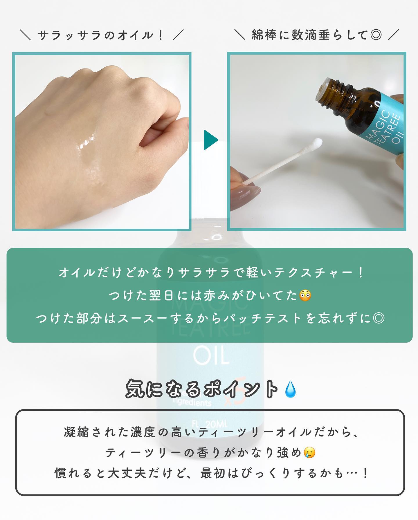 - マジックティーツリーオイルは、乾燥や皮脂による肌悩みをスポットケアし、整える商品です。ブラン代表の整肌成分である4‐テルピネオールで肌トラブルの原因の1つである皮脂を素早くケアします。 【このような方におススメ】 ✔乾燥による肌悩みが気になる方 ✔過度な皮脂と油分が気になる方 ✔べたつきのないスキンケアを探されている方 ✔肌荒れを防ぎたい方 ✔年齢性別肌タイプ関係なく使用できる商品を探されている方 【使用方法】 ①洗顔後、コットンに適量を取り、軽くふき取った後馴染ませます。 ②気になる部分の肌をきれいに洗顔後、トナー→クリームの順でお肌を整えます。 ③綿棒に1~2滴落とし、気になる部分に塗ります。 経過を見て朝晩のスキンケアの最後の段階に塗ることを繰り返します。
