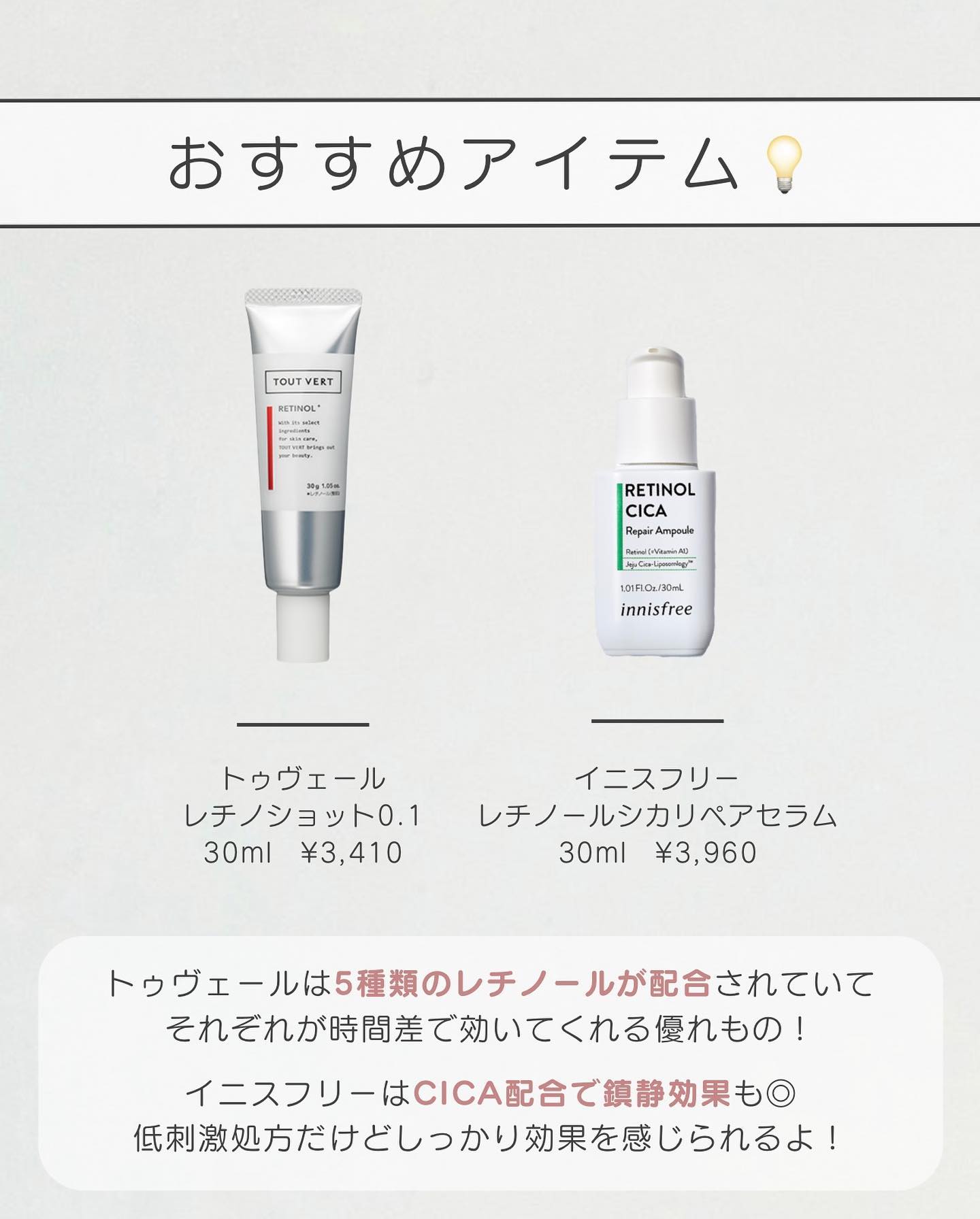 レチノールは美肌効果がめちゃめちゃ高い😳! ただレチノールは副反応が出てしまう方が多いので、使用の際は様子を見てください😭💧 🤍ニキビ、毛穴にお悩みの方向けに情報を発信中◎