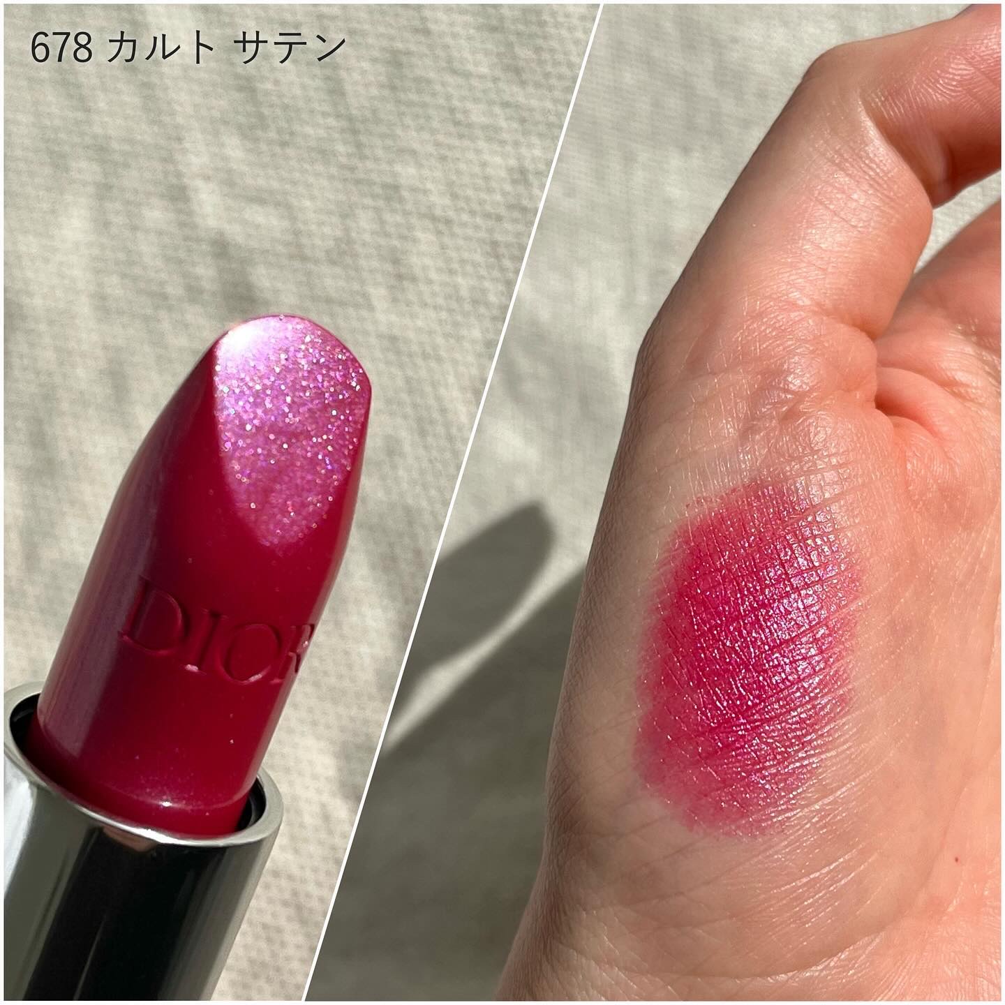 Dior ルージュトラファルガーと LUNASOL スカーレットパッションの比較!! スウォッチだと本当に似てる。まじで笑っちゃうくらい似てる(笑) Diorの方が全体的にラメが入っていて ギラッとした質感なので、派手さがあるかも。 LUNASOLは細かいパールで ほんのりツヤっとして見えて、滑らかな感じ。 Diorの方がバーン!と色が出やすくて LUNASOLは重ねて色を出していく感じ。 Diorのが青み強めで可愛いイメージになりやすくて LUNASOLはニュートラル寄りで大人っぽい。 Diorはオフの日、しっかりメイクで盛りたい日用 LUNASOLは仕事の日でも、きちんとしたい日でも使えるな 色は似てるんだけど、仕上がりの雰囲気や イメージが変わってくるから どっちもあって良かったなと思ってます(笑)
