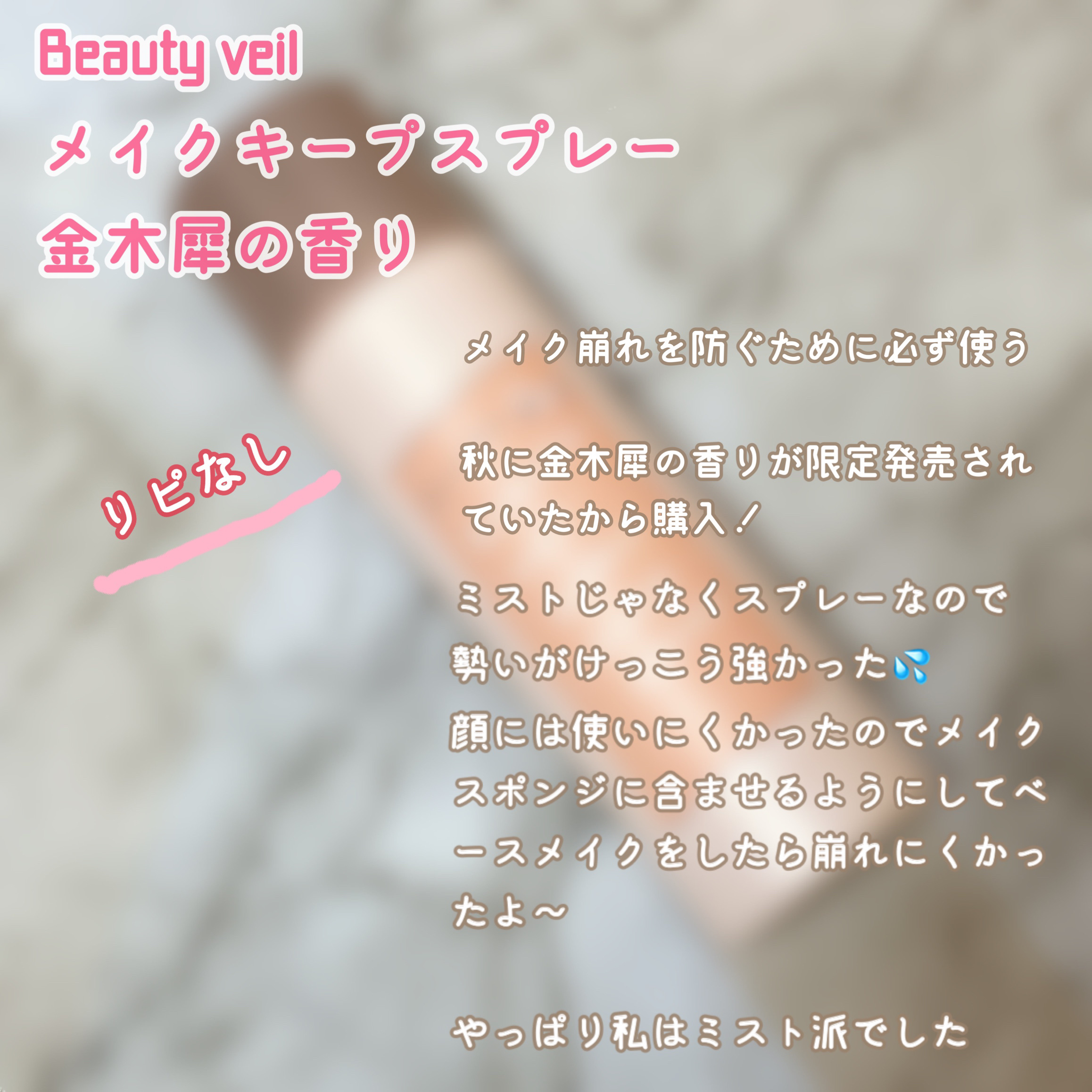 今回は、ビューティヴェール メイクキープスプレーをご紹介します。こちらのメイクキープスプレーは、メイク後に2秒スプレーするだけで、お肌をコーティングしてメイク崩れを防いでくれます。美容成分98%配合でお肌にも負担をかけず、メイクキープ出来て嬉...
