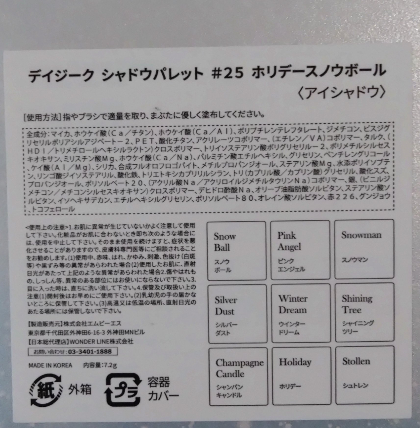 - <01 シュガーブラウニー> タルク、マイカ、ジメチコン、酸化鉄、ホウケイ酸(Ca/チタン)、イソドデカン、合成フルオロフロゴパイト、ホウケイ酸(Ca/Al)、酸化チタン、ステアロイルオキシステアリン酸オクチルドデシル、シリカ、フェニルトリメチコン、メタクリル酸メチルクロスポリマー、ジエチルヘキサン酸ネオペンチルグリコール、ミリスチン酸Mg、メチルプロパンジオール、ナイロン-12、(ビニルジメチコン/メチコンシルセスキオキサン)クロスポリマー、プロパンジオール、ステアリン酸Mg、ラウリン酸ヘキシル、(ジメチコン/ビニルジメチコン)クロスポリマー、マカデミア種子油、マンガンバイオレット、リンゴ酸ジイソステアリル、(ヘキシルデカン酸/セバシン酸)ジグリセリルオリゴエステル、ヘキサ(ヒドロキシステアリン酸/ステアリン酸/ロジン酸)ジペンタエリスリチル、セスキイソステアリン酸ソルビタン、テトラ(ヒドロキシステアリン酸/イソステアリン酸)ジペンタエリスリチル、ホウケイ酸(Ca/Na)、ステアリン酸ジメチコノール、トリエトキシカプリリルシラン、カルミン、サラソウジュ種子脂、ジフェニルシロキシフェニルトリメチコン、ジイソステアリン酸ポリグリセリル-3、黄4、赤226、合成ワックス、酸化スズ、グンジョウ、ラウロイルリシン、メチコン、水 <02 ローズペタル> タルク、マイカ、ジメチコン、ホウケイ酸(Ca/チタン)、酸化チタン、ホウケイ酸(Ca/Al)、合成フルオロフロゴパイト、酸化鉄、ナイロン-12、トリエチルヘキサノイン、シリカ、ホウケイ酸(Ca/Na)、メタクリル酸メチルクロスポリマー、ジエチルヘキサン酸ネオペンチルグリコール、ミリスチン酸Mg、フェニルトリメチコン、トリイソステアリン酸ポリグリセリル-2、ステアロイルオキシステアリン酸オクチルドデシル、ステアリン酸Mg、メチルプロパンジオール、オクチルドデカノール、マンガンバイオレット、赤226、リンゴ酸ジイソステアリル、ヘキサ(ヒドロキシステアリン酸/ステアリン酸/ロジン酸)ジペンタエリスリチル、プロパンジオール、ラウリン酸ヘキシル、マカデミア種子油、イソステアリン酸水添ヒマシ油、(ジメチコン/ビニルジメチコン)クロスポリマー、窒化ホウ素、カルミン、(ヘキシルデカン酸/セバシン酸)ジグリセリルオリゴエステル、ネオペンタン酸イソステアリル、グンジョウ、セスキイソステアリン酸ソルビタン、(HDI/トリメチロールヘキシルラクトン)クロスポリマー、ポリブテン、酸化スズ、トリエトキシカプリリルシラン、フェノキシエタノール、ラウロイルリシン、ステアリン酸ジメチコノール、合成ワックス、黄5、黄4、水添レシチン、メチコン、コンジョウ、水 <03 ヌードポーション> タルク、マイカ、ポリブチレンテレフタレート、ビスジグリセリルポリアシルアジペート-2、ジメチコン、ホウケイ酸(Ca/チタン)、ホウケイ酸(Ca/Al)、シリカ、酸化チタン、アクリレーツコポリマー、(エチレン/VA)コポリマー、酸化鉄、合成フルオロフロゴパイト、ナイロン-12、トリイソステアリン酸ポリグリセリル-2、イソドデカン、ホウケイ酸(Ca/Na)、ステアロイルオキシステアリン酸オクチルドデシル、フェニルトリメチコン、マンガンバイオレット、メチルプロパンジオール、オクチルドデカノール、メタクリル酸メチルクロスポリマー、プロパンジオール、ヘキサ(ヒドロキシステアリン酸/ステアリン酸/ロジン酸)ジペンタエリスリチル、マカデミア種子油、リンゴ酸ジイソステアリル、ミリスチン酸Mg、ステアリン酸ジメチコノール、ステアリン酸Mg、ジエチルヘキサン酸ネオペンチルグリコール、トリエトキシカプリリルシラン、水添レシチン、ラウリン酸ヘキシル、カルミン、(ジメチコン/ビニルジメチコン)クロスポリマー、(ヘキシルデカン酸/セバシン酸)ジグリセリルオリゴエステル、セスキイソステアリン酸ソルビタン、酸化スズ、フェノキシエタノール、合成ワックス、メチコン、黄4、グンジョウ、水 <09 スイートシリアル> タルク、ホウケイ酸(Ca/チタン)、マイカ、酸化チタン、ホウケイ酸(Ca/Al)、ホウケイ酸(Ca/Na)、ビスジグリセリルポリアシルアジペート-2、合成フルオロフロゴパイト、オクテニルコハク酸デンプンAl、フェニルトリメチコン、窒化ホウ素、トリ(カプリル酸/カプリン酸)グリセリル、ポリブチレンテレフタレート、ナイロン-12、ステアロイルオキシステアリン酸オクチルドデシル、トリイソステアリン酸ポリグリセリル-2、酸化鉄、ミリスチン酸Mg、アクリレーツコポリマー、ジメチコン、メチルプロパンジオール、シリカ、ステアリン酸Mg、(エチレン/VA)コポリマー、ジエチルヘキサン酸ネオペンチルグリコール、ヘキサ(ヒドロキシステアリン酸/ステアリン酸/ロジン酸)ジペンタエリスリチル、プロパンジオール、(ジフェニルジメチコン/ビニルジフェニルジメチコン/シルセスキオキサン)クロスポリマー、リンゴ酸ジイソステアリル、ポリブテン、メタクリル酸メチルクロスポリマー、ステ