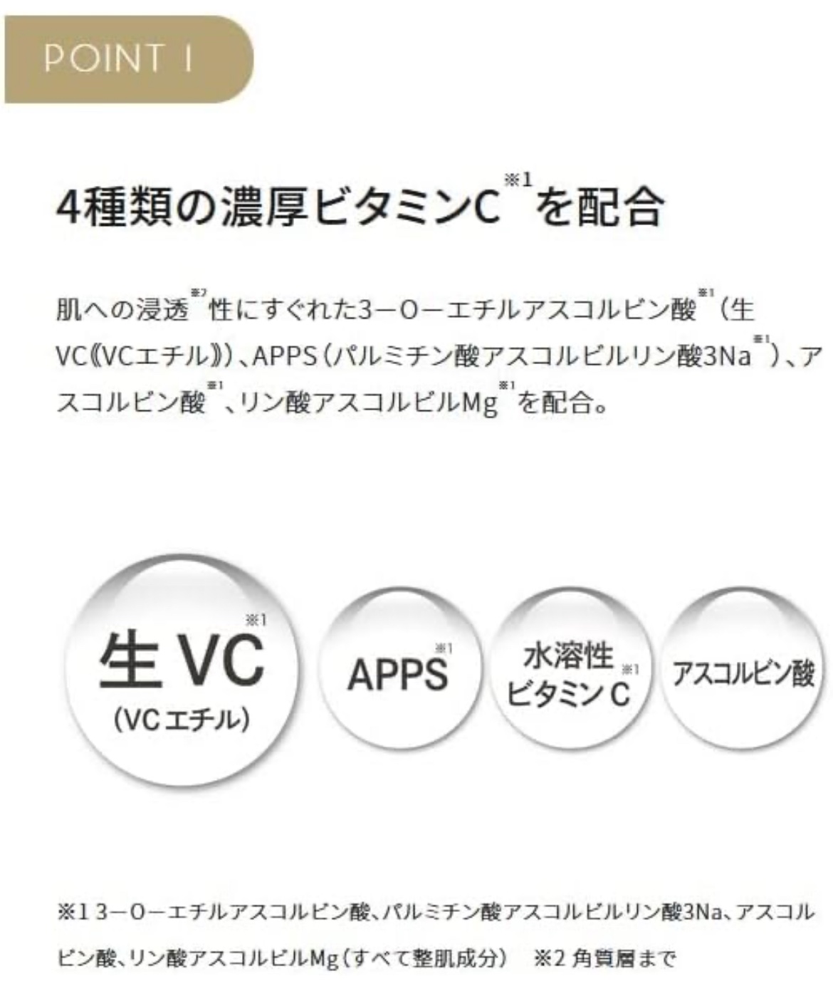 - 生ビタミン C(VC エチル)をはじめ、浸透型*1ビタミン C(APPS)*2、水溶性ビタミンC誘導体*3、アスコルビン酸の4種類のビタミンC(全て整肌成分)を配合。 肌に潤いを与え、透明感のある肌へ導きます。 *1角質層まで *2パルミチン酸アスコルビルリン酸3Na *3リン酸アスコルビルMg