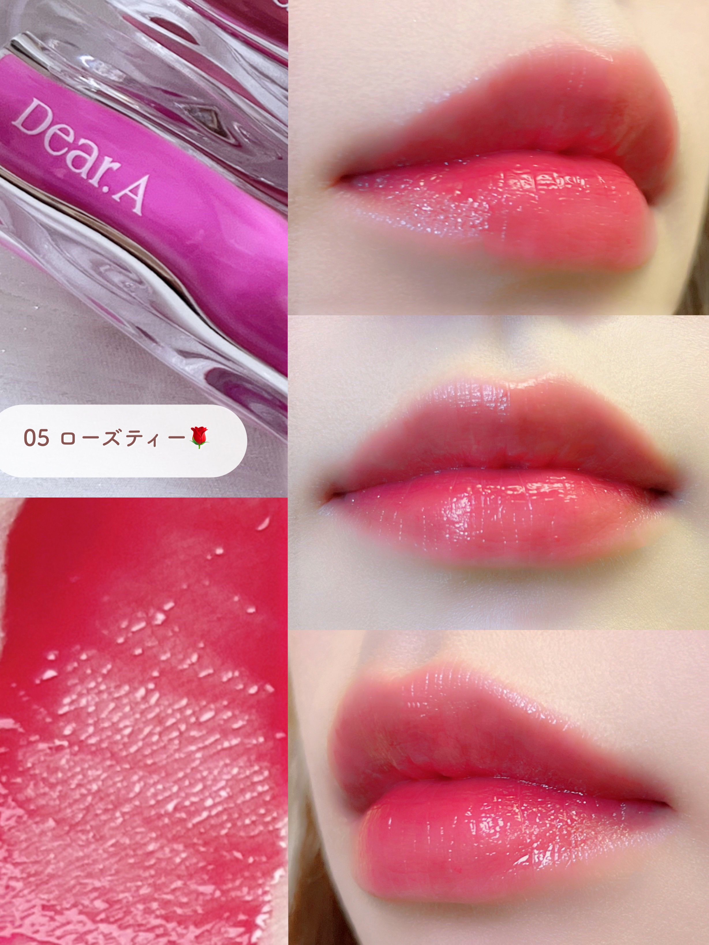 色味がめちゃくちゃ好きなくすみ系のローズピンク◎ 手に出した時は濃い色かな?と思いましたが、唇に塗ると派手じゃないどんなメイクにも合いそうな使いやすいカラー◎ 水光ティントだけあって唇ツヤツヤ💋 チップにしなりがあるからか塗りやすくて、軽い塗り心地なので使用感も◎ 色味も使用感も良くて他のお色も欲しくなっちゃうティントでした💄