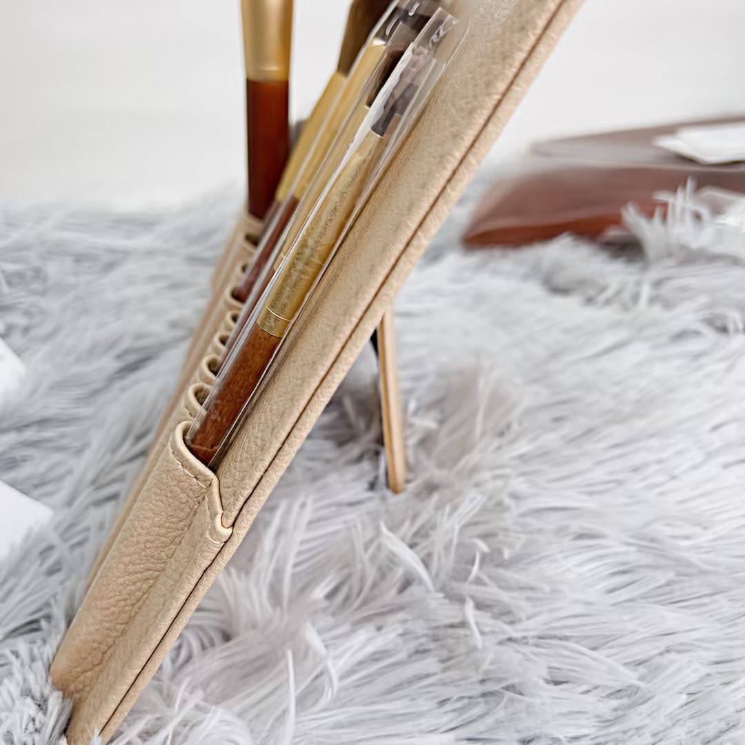持ち歩けるサイズ&毛質が良い! オールブラックで竹のようになっているクールなデザインで、表面の凹凸のおかげなのか手にフィットする感じがして嬉しいポイントでした! ファンデーションブラシでパウダーファンデを仕上げると毛穴が目立たず綺麗に仕上がりました。 斜めカットと極細のアイシャドウブラシは、ラインをぼかしたり下まぶたメイクにもかなり便利です。 付属のポーチもオールブラックで高級感があり素敵で、とても満足しています!