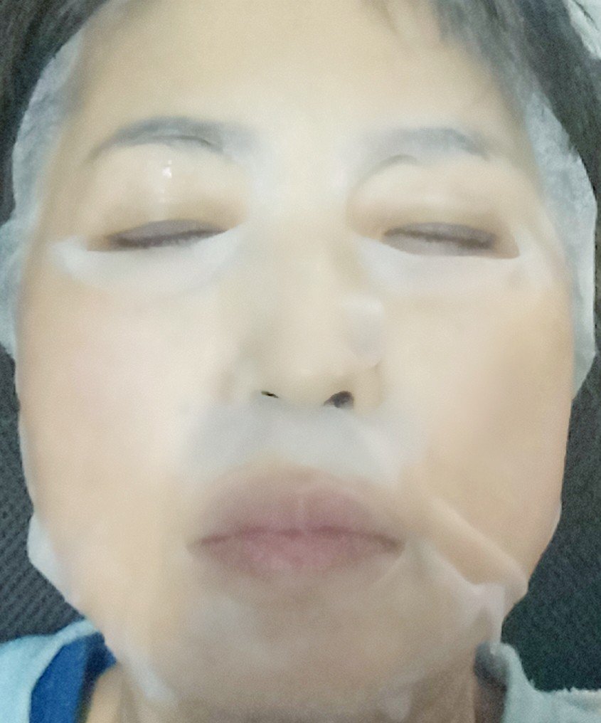 金コロイドと加水分解シルクが贅沢に配合されていて、肌に柔軟性を与え滑らかなお肌へ導いてくれるそう。 乾燥肌やエイジングケアに最適なシートマスクなんだとか♪ シートは国産コットン100%のシート。柔らかくて肌あたりが良い✨ワイドサイズでぴたっとフィットして使いやすかったです😊 20分間使用しました。 美容液たっぷりなのに液ダレしないし、ベタつきもなし♪ マスクも乾くことなく、保水性が高めでとても良かったです♪