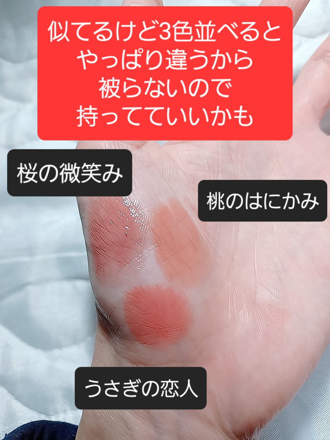 - <BE351 桃のはにかみ> ジフェニルジメチコン、デカエチルヘキサン酸ポリグリセリル-10、(VP/ヘキサデセン)コポリマー、イソドデカン、トリメチルシロキシフェニルジメチコン、テトラエチルヘキサン酸ペンタエリスリチル、トリイソステアリン酸ポリグリセリル-2、合成ワックス、ジメチコン、フェニルトリメチコン、イソステアリン酸デキストリン、DPG、トコフェロール、ヒアルロン酸Na、BHT、(エイコセン/ビニルピロリドン)コポリマー、(エチレン/プロピレン)コポリマー、カルナウバロウ、キャンデリラロウ、キャンデリラロウエステルズ、ジメチルシリル化シリカ、スクワラン、トリイソステアリン酸イソプロピルチタン、ハイドロゲンジメチコン、メチコン、水酸化Al、炭酸Ca、酸化チタン、酸化鉄、黄4、赤202 <BR350 林檎の口づけ> ジフェニルジメチコン、デカエチルヘキサン酸ポリグリセリル-10、(ビニルピロリドン/ヘキサデセン)コポリマー、イソドデカン、トリメチルシロキシフェニルジメチコン、テトラエチルヘキサン酸ペンタエリスリチル、トリイソステアリン酸ポリグリセリル-2、合成ワックス、ジメチコン、フェニルトリメチコン、イソステアリン酸デキストリン、DPG、トコフェロール、ヒアルロン酸Na、BHT、(エイコセン/ビニルピロリドン)コポリマー、(エチレン/プロピレン)コポリマー、アルミナ、カルナウバロウ、キャンデリラロウ、キャンデリラロウエステルズ、シリカ、ジメチルシリル化シリカ、スクワラン、ハイドロゲンジメチコン、炭酸Ca、酸化チタン、酸化鉄、黄4、赤202 <BR352 駆け引きワイン(限定)> ジフェニルジメチコン、デカエチルヘキサン酸ポリグリセリル-10、(VP/ヘキサデセン)コポリマー、イソドデカン、トリメチルシロキシフェニルジメチコン、テトラエチルヘキサン酸ペンタエリスリチル、合成ワックス、ジメチコン、フェニルトリメチコン、トリイソステアリン酸ポリグリセリル-2、イソステアリン酸デキストリン、DPG、トコフェロール、ヒアルロン酸Na、BHT、(エイコセン/ビニルピロリドン)コポリマー、(エチレン/プロピレン)コポリマー、アルミナ、カルナウバロウ、キャンデリラロウ、キャンデリラロウエステルズ、シリカ、ジメチルシリル化シリカ、スクワラン、ハイドロゲンジメチコン、炭酸Ca、酸化チタン、酸化鉄、黄4、赤202 <OR250 海星の恋心> ジフェニルジメチコン、デカエチルヘキサン酸ポリグリセリル-10、(ビニルピロリドン/ヘキサデセン)コポリマー、イソドデカン、トリメチルシロキシフェニルジメチコン、トリイソステアリン酸ポリグリセリル-2、テトラエチルヘキサン酸ペンタエリスリチル、合成ワックス、ジメチコン、フェニルトリメチコン、イソステアリン酸デキストリン、DPG、トコフェロール、ヒアルロン酸Na、BHT、(エイコセン/ビニルピロリドン)コポリマー、(エチレン/プロピレン)コポリマー、アルミナ、カルナウバロウ、キャンデリラロウ、キャンデリラロウエステルズ、シリカ、ジメチルシリル化シリカ、スクワラン、ハイドロゲンジメチコン、炭酸Ca、酸化チタン、酸化鉄、黄4、赤202 <PK850 うさぎの恋人> ジフェニルジメチコン、デカエチルヘキサン酸ポリグリセリル-10、(ビニルピロリドン/ヘキサデセン)コポリマー、イソドデカン、トリメチルシロキシフェニルジメチコン、テトラエチルヘキサン酸ペンタエリスリチル、トリイソステアリン酸ポリグリセリル-2、合成ワックス、ジメチコン、フェニルトリメチコン、イソステアリン酸デキストリン、DPG、トコフェロール、ヒアルロン酸Na、BHT、(エイコセン/ビニルピロリドン)コポリマー、(エチレン/プロピレン)コポリマー、アルミナ、カルナウバロウ、キャンデリラロウ、キャンデリラロウエステルズ、シリカ、ジメチルシリル化シリカ、スクワラン、ハイドロゲンジメチコン、炭酸Ca、酸化チタン、酸化鉄、黄4、赤202 <PK851 わがままな肉球> ジフェニルジメチコン、デカエチルヘキサン酸ポリグリセリル-10、(ビニルピロリドン/ヘキサデセン)コポリマー、イソドデカン、トリメチルシロキシフェニルジメチコン、テトラエチルヘキサン酸ペンタエリスリチル、トリイソステアリン酸ポリグリセリル-2、合成ワックス、ジメチコン、フェニルトリメチコン、イソステアリン酸デキストリン、DPG、トコフェロール、ヒアルロン酸Na、BHT、(エイコセン/ビニルピロリドン)コポリマー、(エチレン/プロピレン)コポリマー、アルミナ、カルナウバロウ、キャンデリラロウ、キャンデリラロウエステルズ、シリカ、ジメチルシリル化シリカ、スクワラン、ハイドロゲンジメチコン、炭酸Ca、酸化チタン、酸化鉄、黄4、赤202 <PK852 桜の微笑み> ジフェニルジメチコン、デカエチルヘキサン酸ポリグリセリル-10、(VP/ヘキサデセン)コポリマー、イソドデカン、トリメチルシロキシフェニルジメチコン、テトラエチルヘキサン酸ペンタエリスリチル、合成ワックス、トリイソステアリン酸ポリグリセリル-2、ジメチコン、フェニルトリメ