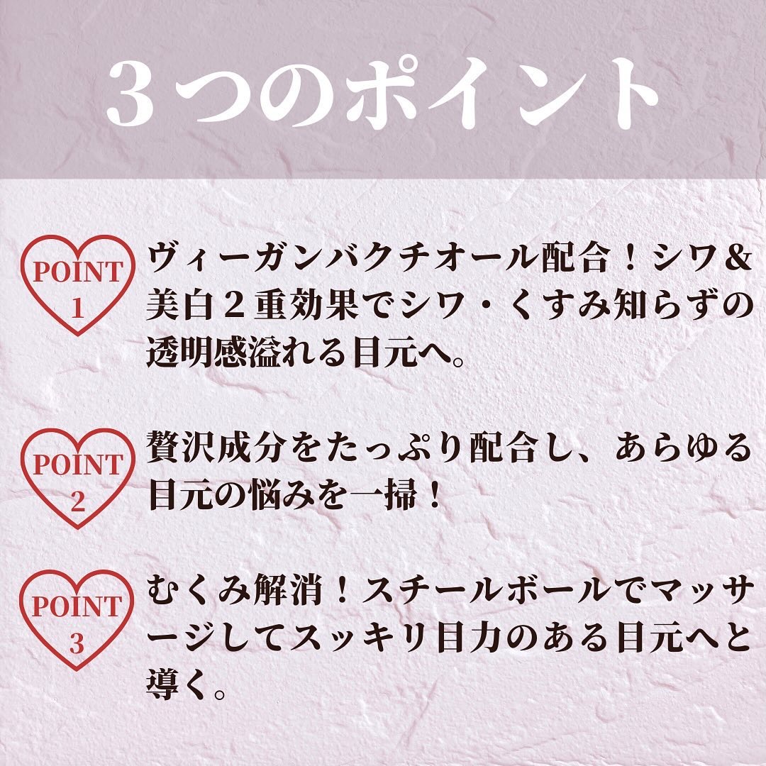 エイジングケア初心者さんや将来の為のスキンケアお探しの方にとってもおすすめだよ〜! Q0010総合・ビューティー部門1位を獲得!話題の ヴィーガンリポソームレチノル3%セラム。 薄い皮膚だからこそ繊細なケアが必要!ヴィーガン バクチオール0.2%とアデノシン、カフェインとペプチド複合物でたるんだ目のハリケア。