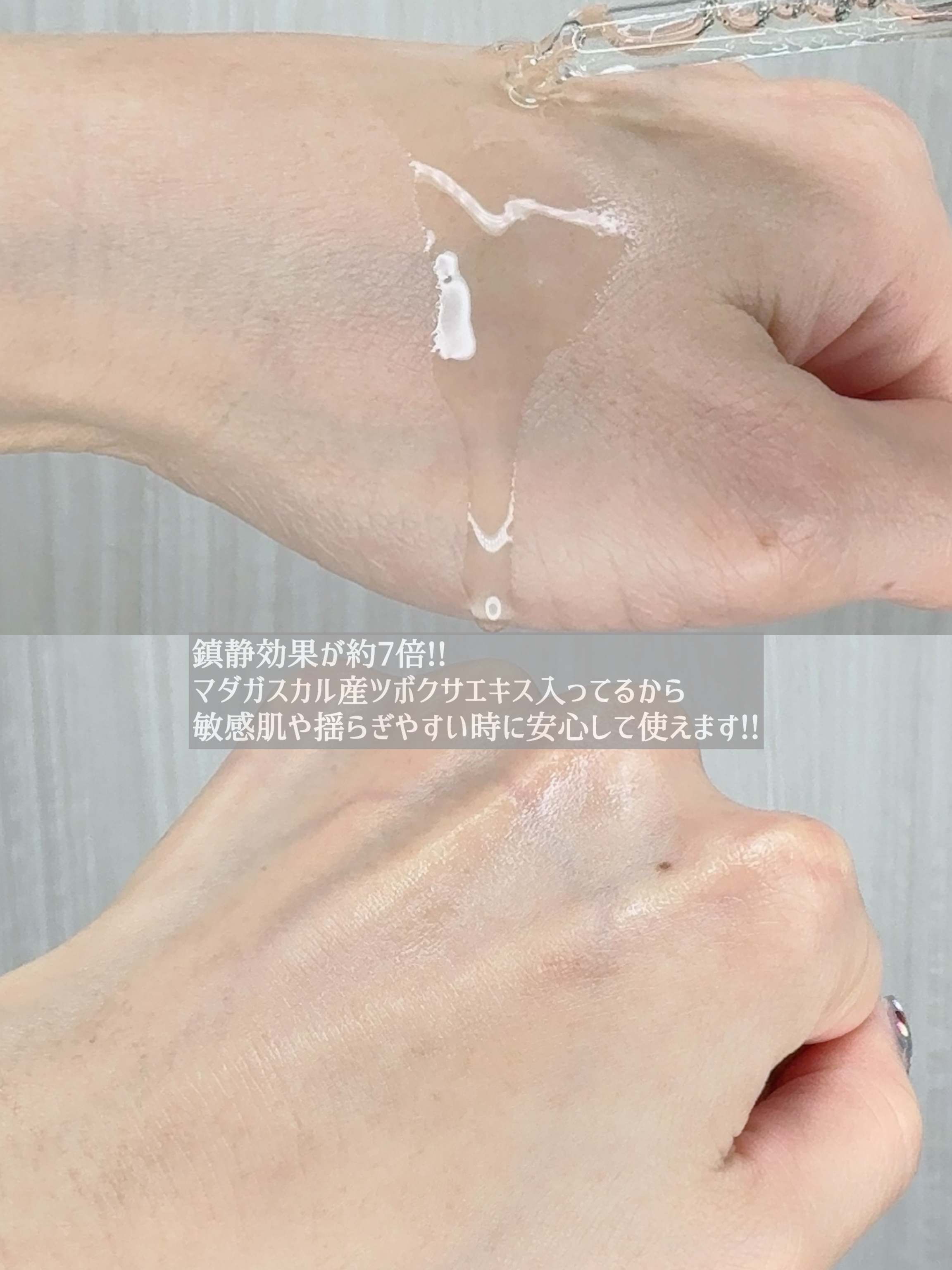- 太古の自然マダガスカルの自然由来ツボクサエキス*1を100%配合し、乾燥により刺激を受けた肌を整える美容液です。敏感に傾いた肌を素早く整える*2と同時に、乾燥による外部の刺激によって荒れやすい肌をしっとり艶やかに導きます。ベタつかないサラっとしたテクスチャーで、潤いをたっぷりと。 *1ツボクサエキス(保湿成分) *2パッチテスト済み(すべての方に刺激が起きないわけではありません)