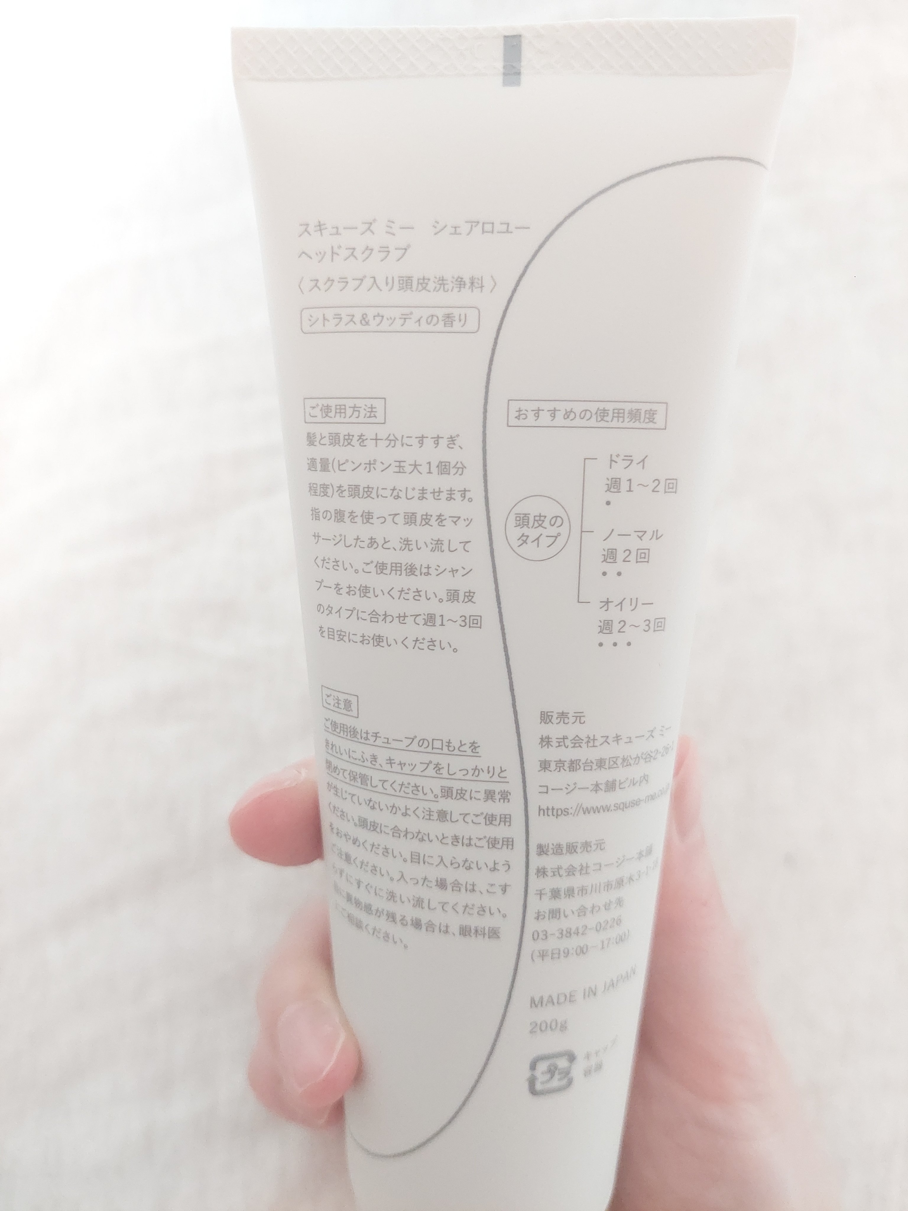 - <シャンプー前の新習慣、頭皮スクラブ>シャンプーでは落としきれない毛穴汚れや皮脂を取り除き、ニオイをケアする頭皮スクラブ。粒の大きさが異なる2種のソルトスクラブを配合。マッサージ効果により、こり固まった頭皮を柔らかくほぐします。フレッシュで心地よいシトラス&ウッディの香り。 ●天然由来保湿オイル配合●チューブタイプ