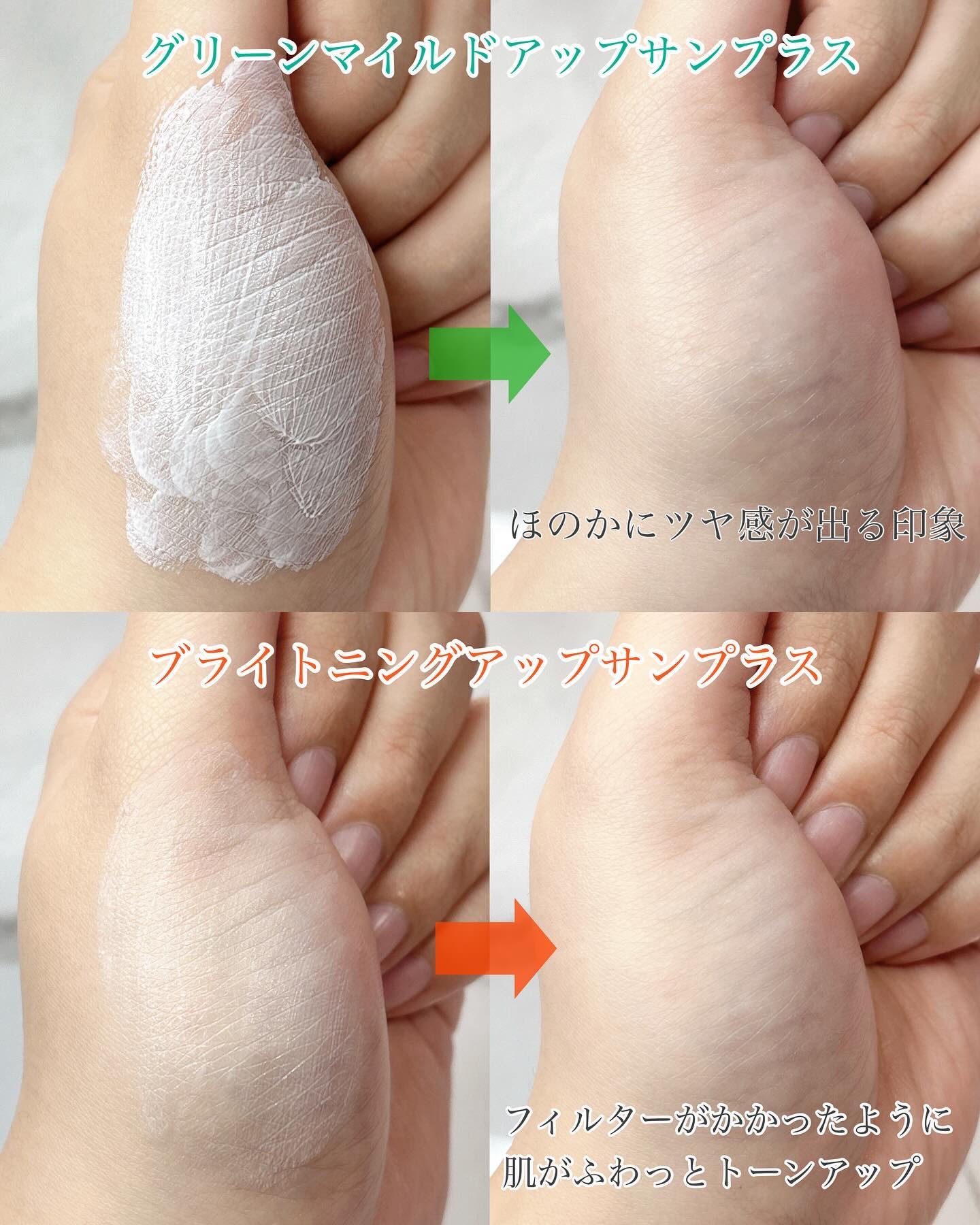 グリーンマイルドアップサンプラスはオリーブヤングで5年間連続で日焼け止め部門受賞! クリアカラーで特に肌のトーン変化は無いけどほのかにツヤが出る印象! ブライトニングアップサンプラスはピーチベースで自然に肌をトーンアップさせてくれる、化粧下地としても使える日焼け止め!
