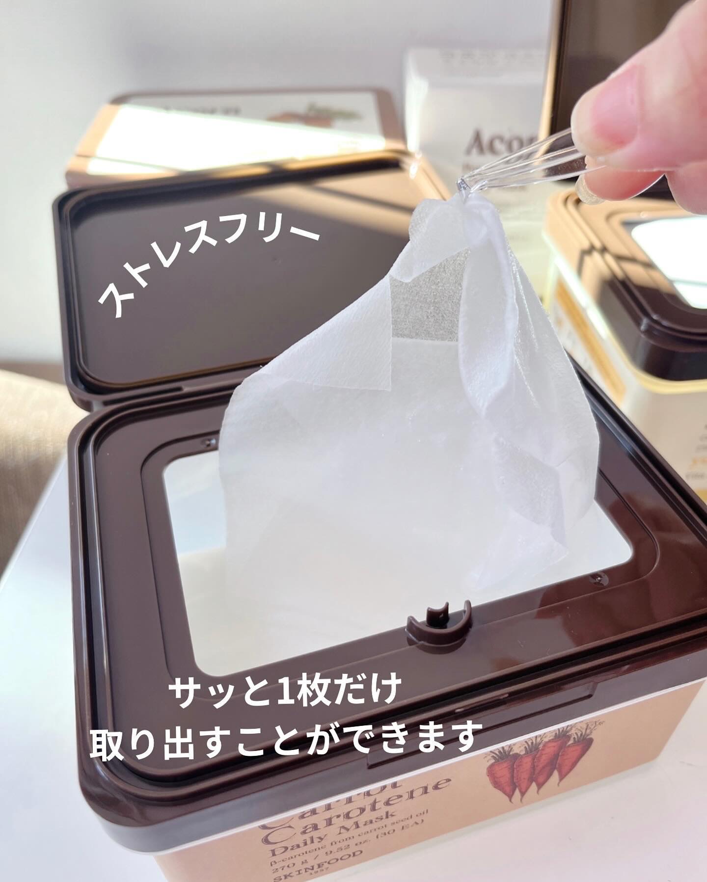 一番人気のキャロットパッド♡ 厚手の柔らかいコットンパッドだから低刺激。水分感のある瑞々しいパッド。 エッセンスがたっぷり含まれている薄手のシートマスクでフィット感が良い。高保湿ではないが、しっとり瑞々しく潤う。 鎮静にはキャロットが良いのよ!と教えていただいたのでキャロットだけは何度もリピ買いしてます♡