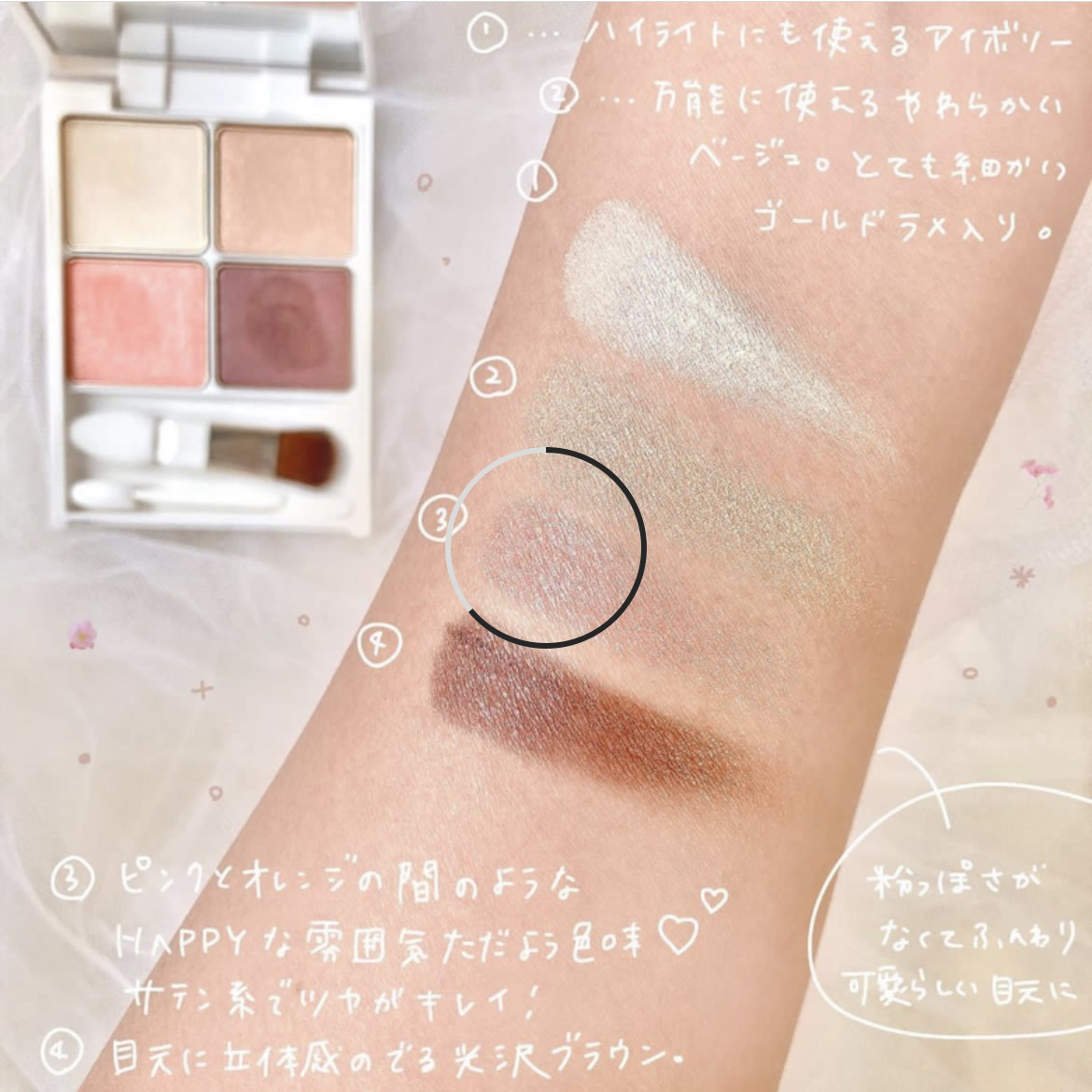 なんとも言えない絶妙なピンク系の3色がそろっていて、技術いらずで自然なグラデーションになります。 ピンクといっても甘々ではなくて落ち着きのある上品なピンク 見た目的に明るい2色はパール感が強くて浮いちゃうかな~?と少し心配でしたが、実際のせてみると、むしろ今までのトーンアップアイシャドウの中ではパール感は控えめかなと思いました。 とてもしっとりした質感で、チップでもブラシでもキレイにのってムラになりくく優秀です🕊 お安いのにカラーも長持ちしてくれるし値段に対してすごく高クオリティです👏🏻