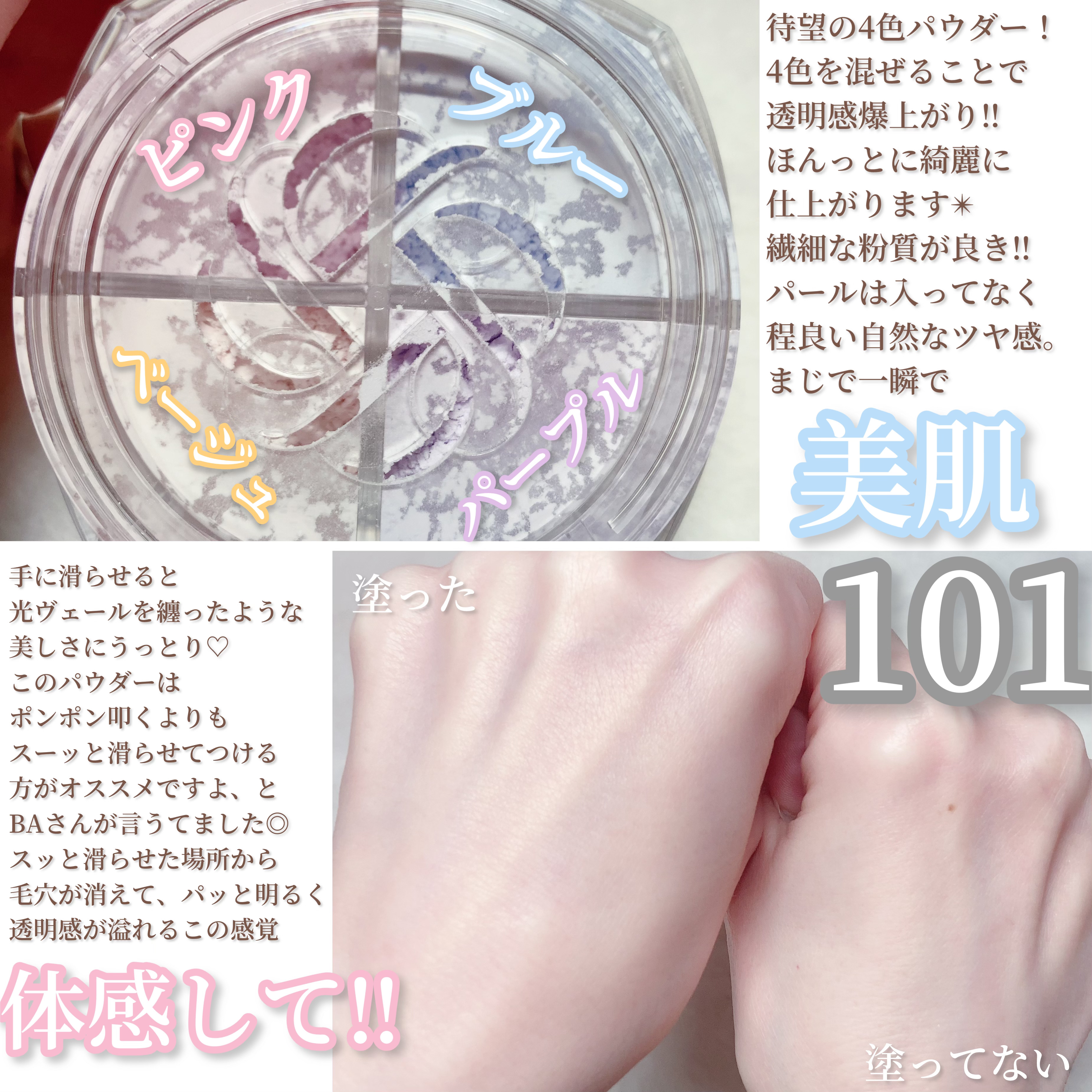 光ヴェールパウダー 光の調合で澄んだ肌を演出すると言われているこのパウダー。 シルキーツヤ(101) ヴェールを纏ったような肌に。ツヤというよりセミツヤかな。 シースルーマット(06,07) 透明感のある柔らかなマット