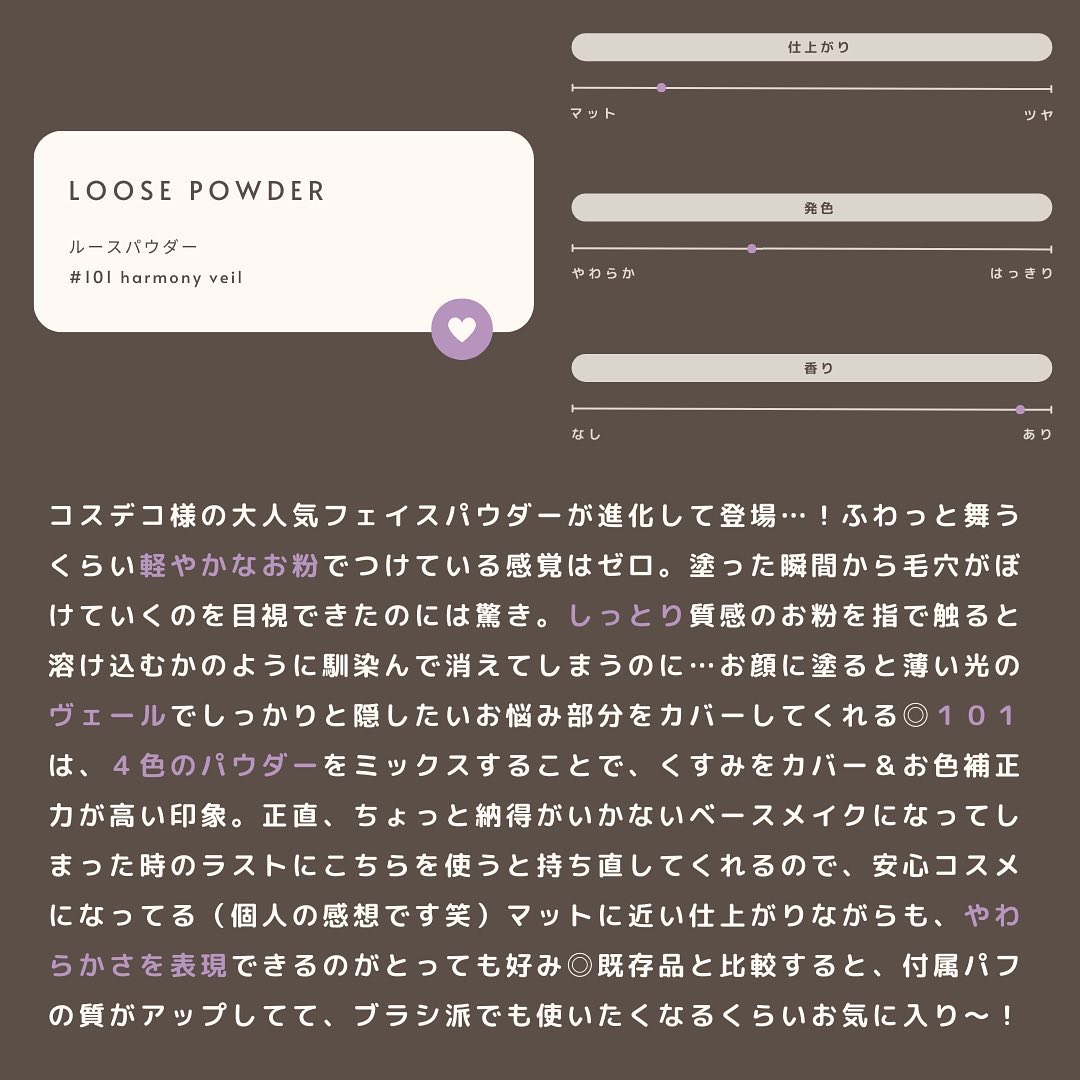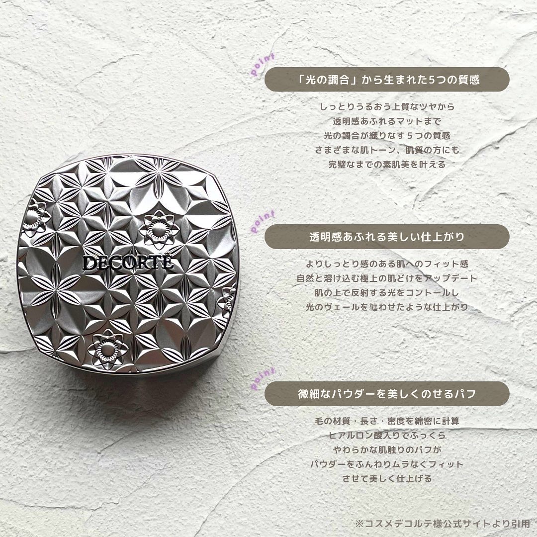 タッチアップして絶対買うと決めてたDECORTÉルースパウダー101harmonyveil軽い着け心地でふわふわさらさらしてるのにしっとりしててヴェールがかかったような肌になれる不思議なパウダーでした!ツヤ感がちゃんとあって自然な透明感でめっ...
