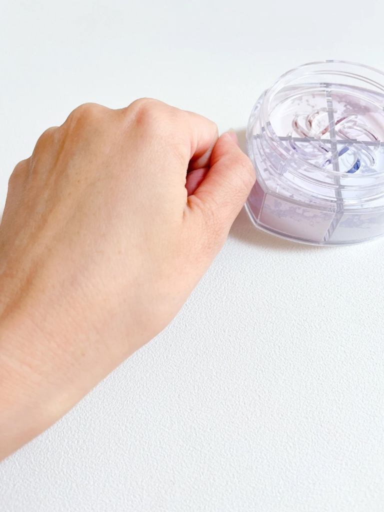 02 ミルキーライトは、ホワイト、ブルー、パープルの 組み合わせでくすんだ肌を華やかに明るくし、 ピュアでキレイな肌トーンに演出してくれるよ! 肌の赤みを抑えてくれてキレイにトーンアップし 透明感のある肌に✨ きめ細かい微細パウダーでサラサラになるので、 夏にも大活躍しそう☺️